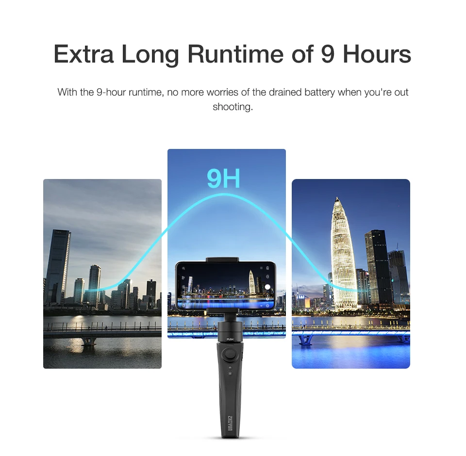 The ergonomic grip enables you to hold the stabilizer comfortably for long periods. All button controls are at your fingertips: Shutter, Modes, Zoom Slider, Joystick and PhoneGo Switcher.