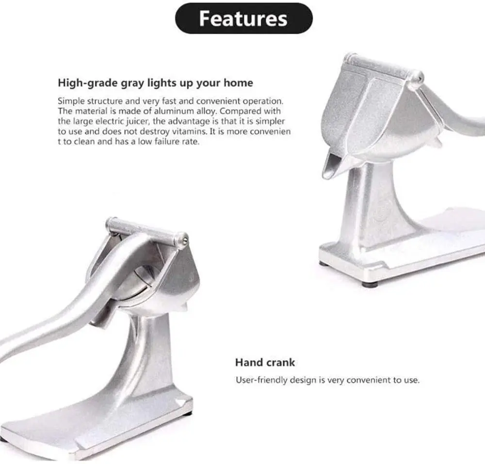 ● Абсолютно новый и высококачественный. ● Изготовлен из алюминиевого сплава, прочный, поверхность обработана безвредным материалом, безопасен в использовании. ● Ручная простая работа, быстро и легко сделать свежий сок, позволит вам пить питательные и здоровые. ● Идеально подходит для извлечения цитрусовых соков, таких как апельсины, мандарины, липы, лимоны и так далее. ● Простота в использовании и очистке. Отличный помощник для изготовления фруктового сока своими руками.