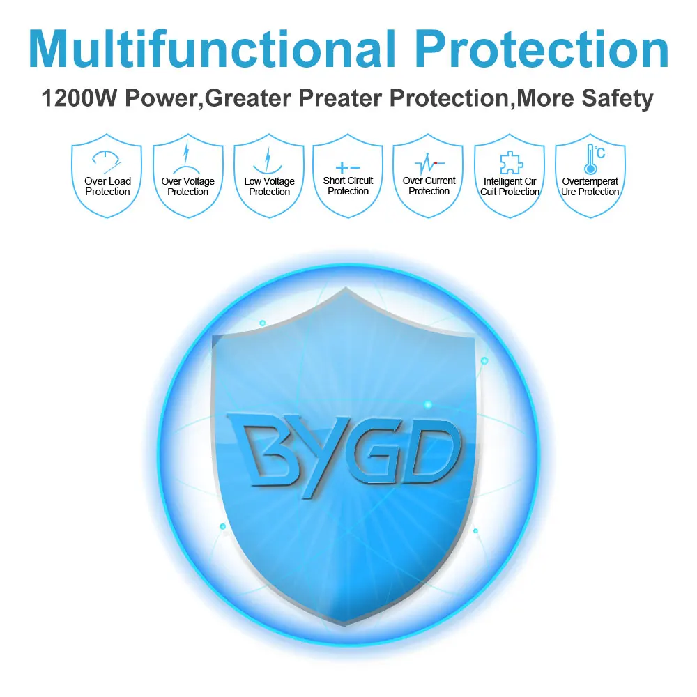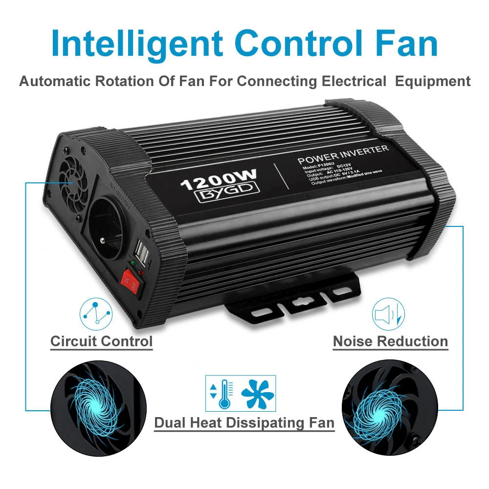 BYGD 1200W инвертор Внимание: Обеспечивает полную мощность до 1200 Вт, не используйте никаких советов, превышающих 1200 Вт. Держите его работать до 85% от соответствующей мощности, чтобы сохранить длительный срок службы автомобильного инвертора. Почему стоит выбрать BYGD: 1 умные зарядные устройства, просто подключите гнездо прикуривателя и запустите автомобиль, инвертор будет готов, инвертор защитит все устройства и автомобильные батареи. 2 высококачественных компонентов автомобильный конвертер производства BYGD мануфактуры. Сертификация FCC CE. 3 бесшумный вентилятор, конкурентоспособные другие бренды, шумный вентилятор, не будет беспокоить вас в дороге. 4 встроенных предохранителя обеспечивают полную защиту ваших устройств, защищают вас и вашу автомобильную зажигалку. Информация о продукте 300 Вт инвертор Размеры: 11,2x6,5x3,1 дюйм (ов) Материал: изоляция и огнестойкость ABS Вес нетто: 4,40 фунт (2000 г) Вход: 12 В постоянного тока Выход переменного тока: 220-240 В переменного тока 10% Выходная розетка: розетка европейского стандарта Эффективность преобразования: 85% Выход USB: 5 В/2,1 а постоянного тока Мощность (розетка переменного тока): 1200 Вт Номинальная, 2400 Вт Пиковая Выходная волна: модифицированная Синусоидальная волна Выходная частота: 50 Гц Внутренний предохранитель: 35Ax4 Вход оповещение о низком напряжении: DC 10,2-10,8 V Выключение входного низкого напряжения: 9,2-9,8 В постоянного тока Выключение входного напряжения: 15-16 В постоянного тока Интеллектуальная защита безопасности: Защита от обратной полярности, короткого замыкания, перенапряжения, низкого напряжения, перегрузки, перегрева, перегрузки по току, импульсной защиты. Посылка: 1x1200 Вт Инвертор 2 кабеля кольцевого соединителя 4 x 35A запасные предохранители 1 x Руководство пользователя