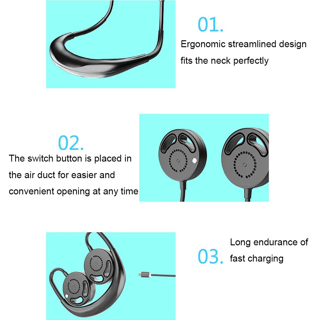 Дизайн без рук: вентилятор с шейным ободком создан с дизайном без рук, вы можете повесить вентилятор вокруг шеи и взять его везде, не будет чувствовать усталость или дискомфорт, когда вы повесите вентилятор в течение длительного времени.