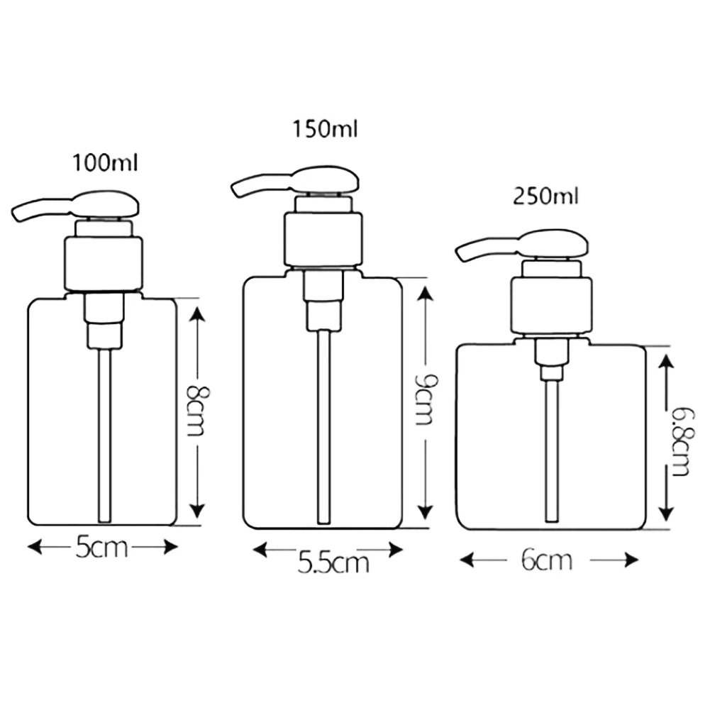 Specifications:Used to hold shampoo, shower lotion, body lotion and other toiletries, keep the desk clean.Practical and suitable for business travel.Refined with high quality material, no plasticizer and other harmful substances, can be used safely. Item Name: Refillable BottleMaterial: PETG + PPCapacity: 100ml/150ml/250ml (Optional)Features: Big Capacity, Portable, RefillableSize: 100ml: 5cm x 8cm/1.97" x 3.15", 150ml: 5.5cm x 9cm/2.16" x 3.54", 250ml: 6cm x 6.8cm/2.36" x 2.67" (Approx.) Notes:Due to the light and screen setting difference, the item's color may be slightly different from the pictures.Please allow slight dimension difference due to different manual measurement. Package Includes:1 x Refillable Bottle