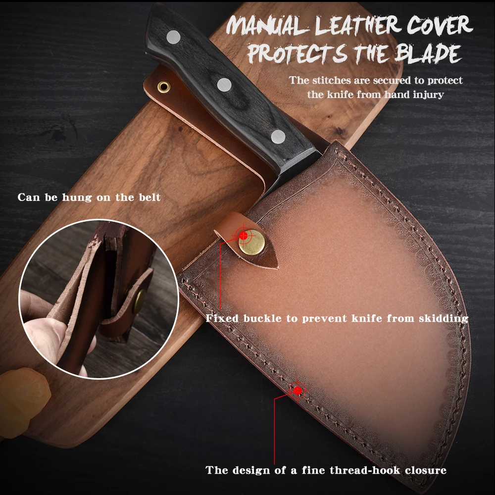 Нож шеф-повара мясника поставляется с оболочкой для защиты вашего ножа и может быть прикреплен к поясу для удобной переноски при использовании на открытом воздухе. (Может быть запах кожаной оболочки, пожалуйста, Повесьте в проветриваемом месте в течение нескольких дней, когда вы получите его.)