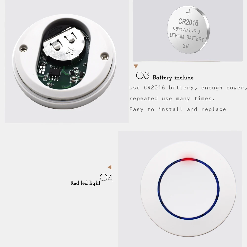 Рабочее напряжение: CR2032 Частота передачи: 433 МГц Тип кодирования: фиксированный код Чувствительность приемника: > -105 дБ Дальность передачи: 10-100 м (открытое поле) Размер: около 50*50*11 мм Особенность: Легкая конструкция. Уникальный внешний вид. Можно установить на стену и в любое другое место, которое вы хотите установить (включая 3 м липучку). Низкое энергопотребление, включая батарею CR2032.
