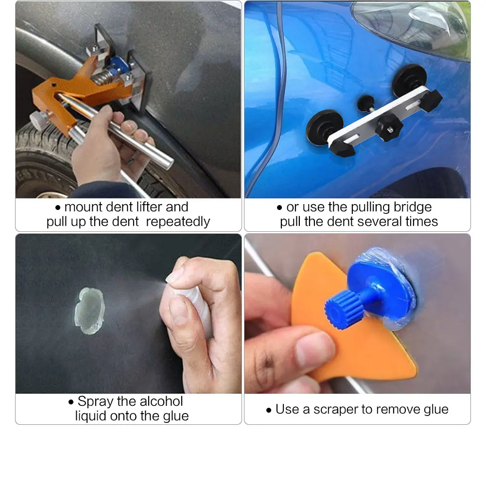 1.Use a line board to find the dent,clean the dent with a clean cloth; 2.Mount the glue stick into the glue gun,pull the trigger to let the glue stick enter into the glue gun, connect the power source and preheat for 5 minutes; 3.Pull the glue gun's trigger to let the hot melt glue apply evenly onto the gule tabs; 4.Fast place the gule tabs with hot melt glue at the center of dent, press lightly until the glue cures and adheres (Let the glue cool for about 8 minutes. The cooling time should be less than 10 minutes and should be shorter slightly in winter); 5. Use the dent lifter/silde hammer/T-handle dent puller to pull up the dent; 6. Check with a line board. If dent still exists, knock it slightly with a Rubber Hammer and tap down; 7. Clean the repaired place with a clean wet cloth.