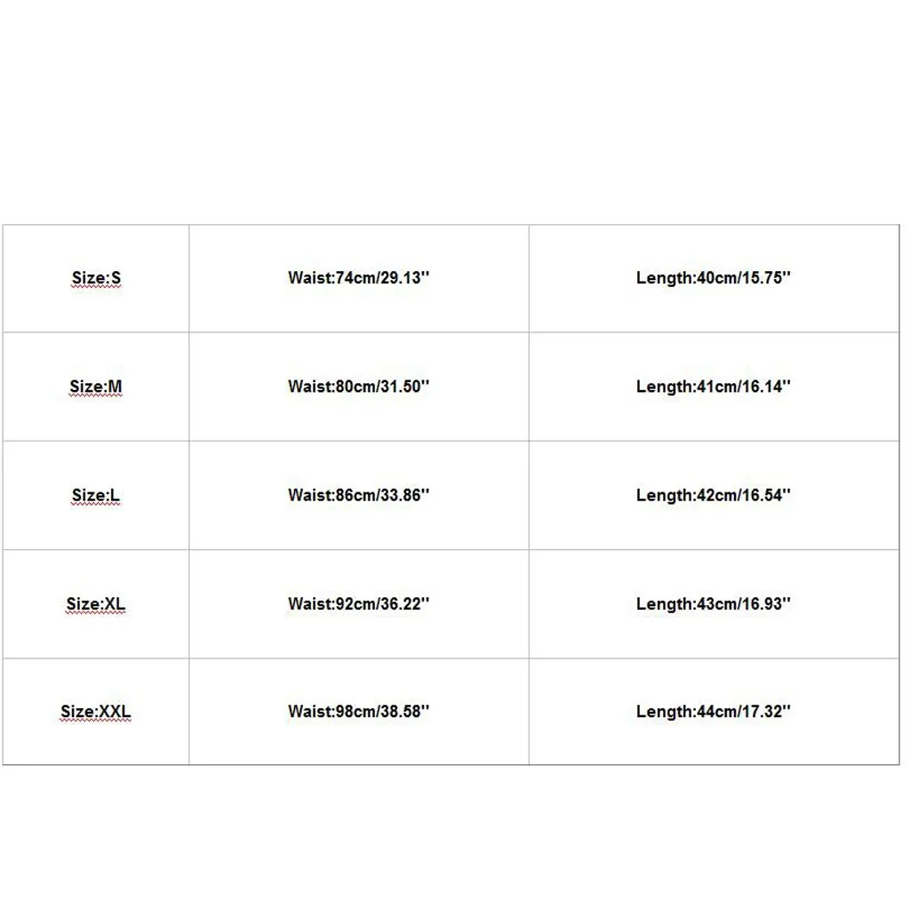 Размер: S талия: 74 см/29,13 ''Длина: 40 см/15,75'' Размер: M талия: 80 см/31,50 ''Длина: 41 см/16,14'' Размер: L талия: 86 см/33,86 ''Длина: 42 см/16,54'' Размер: XL талия: 92 см/36,22 ''Длина: 43 см/16,93'' Размер: XXL Талия: 98 см/38,58 ''Длина: 44 см/17,32''