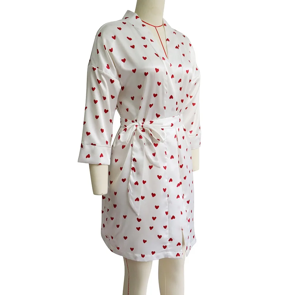 Новое женское шелковое белье с принтом сердца с атласным поясом халат пижама