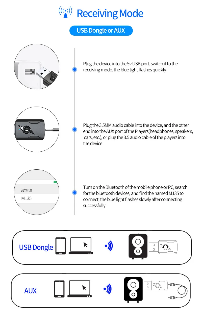 3. Режим приемника: Беспроводная передача аудио мобильных телефонов, планшетов или компьютеров с поддержкой Bluetooth на проводные стерео, колонки или наушники. Поддержка звонков, Bluetooth hands-free.