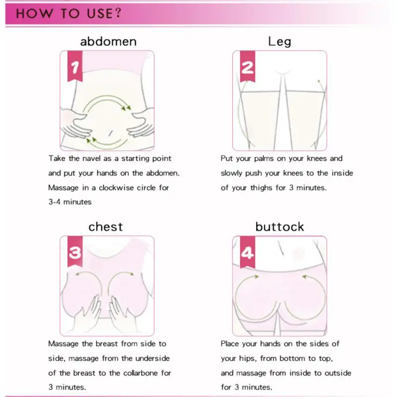 Применение: 1-20 лет после доставки. Наносить на все тело по утрам и вечерам, особенно на живот, грудь, бедра и ягодицы. Аккуратно массируйте до полного впитывания.