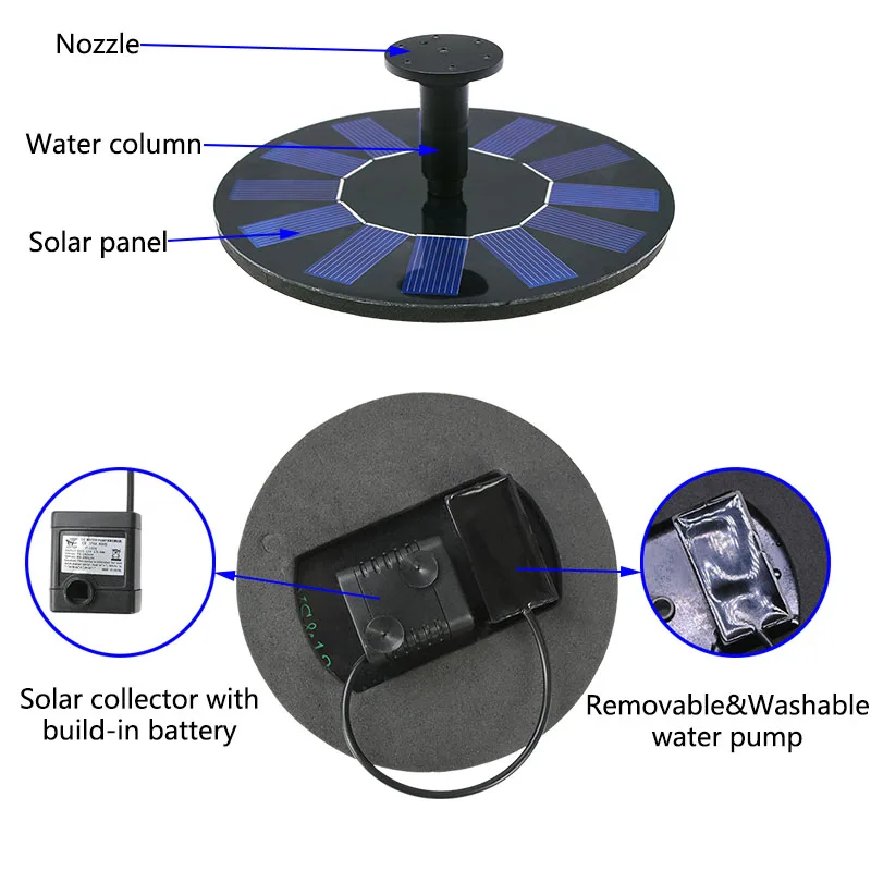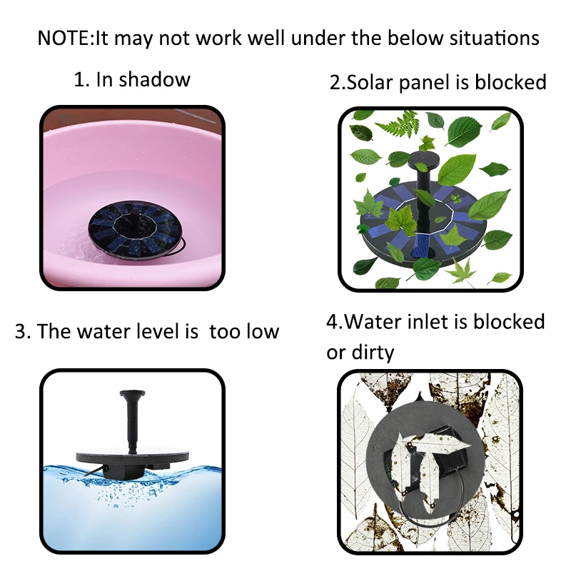 Note: 1. make sure put enough water in the fountain, so pump can stay underwater, completely 2. solar panels must be completely exposed to the sun, not the leaves or other items. Panel surface3. please regular cleaning pump, lest jam pump
