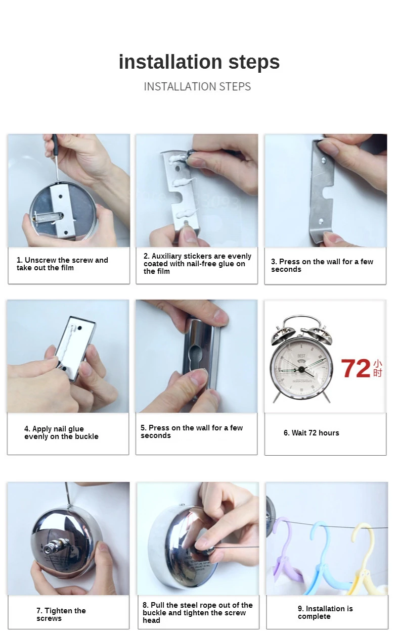 PS: Пожалуйста, обратите внимание на установку без пробивки. Пожалуйста, посмотрите на стену перед установкой. Стена должна быть плоской и прочной стеклянной плиткой и т. д. и не может использоваться на неровных и нетвердых стенах, таких как покраска стен, обои, Известковые стены и т. Д. Подождите 3-5 дней после склеивания на стену и используйте клей без ногтей после того, как он полностью высохнет.