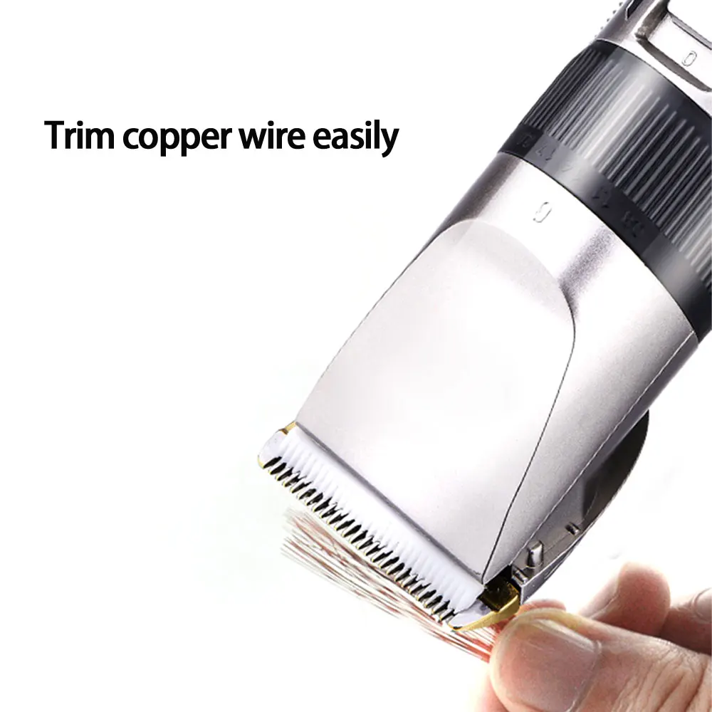 -Регулируемые кусачки можно изменить, чтобы регулировать длину обрезки. 0,8 мм/1,2 мм/1,4 мм/1,8 мм/2,0 мм., а также оснащена 6 направляющей расчески (3 мм, 6 мм, 9 мм, 12 мм).