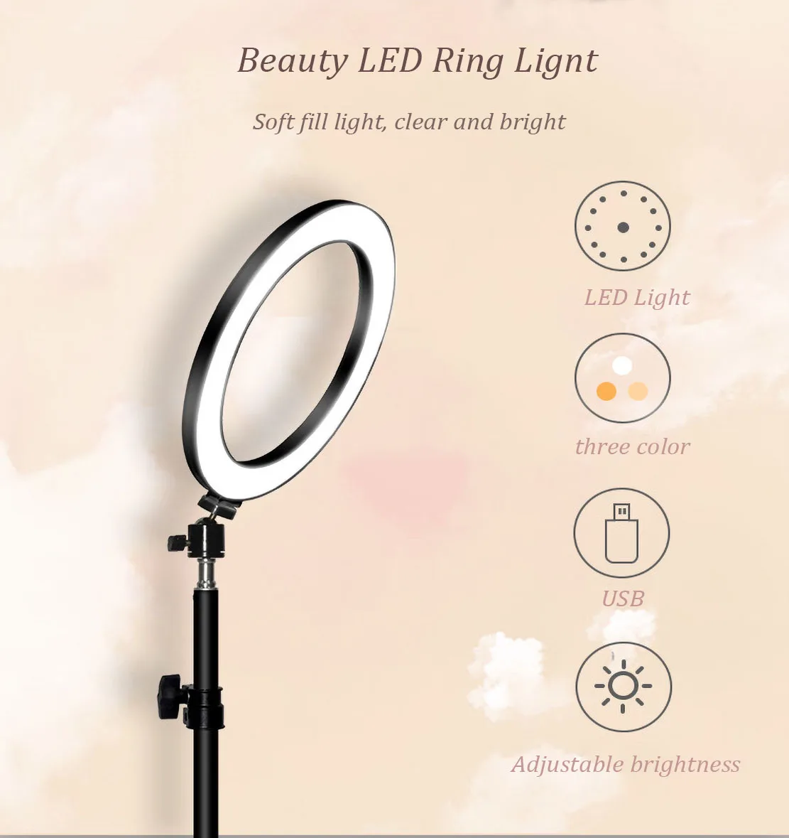 Театура: Размер внешнего кольца: 26 см Индекс цветопередачи: RA/CRI: 80 Размер внутреннего кольца: 20,5 см Общие Люмены: 600-1300LM Количество лампочек: 120 шт. Рабочий Источник питания: 5 В/1 а постоянного тока (5 В/2 а) Мощность: 12 Вт Вес: 0,5 кг Цветовая температура: 2700-7000K Размер одной посылка: 29*26,5*4 см Источник питания: usb Модель лампы: 2835 Светодиодный Угол освещения: 120 Светильник: холодный светильник, теплый светильник, холодный и теплый светильник Материал: АБС-пластик/ПП пластик/алюминиевая Базовая пластина/металлический шланг Срок службы: 2 года Варианты Применения: наружные лампы для фотосъемки, крытые заполняющие огни, Модная фотография, рекламная фотография, видеосъемка, прямая трансляция vibrato и т. д.