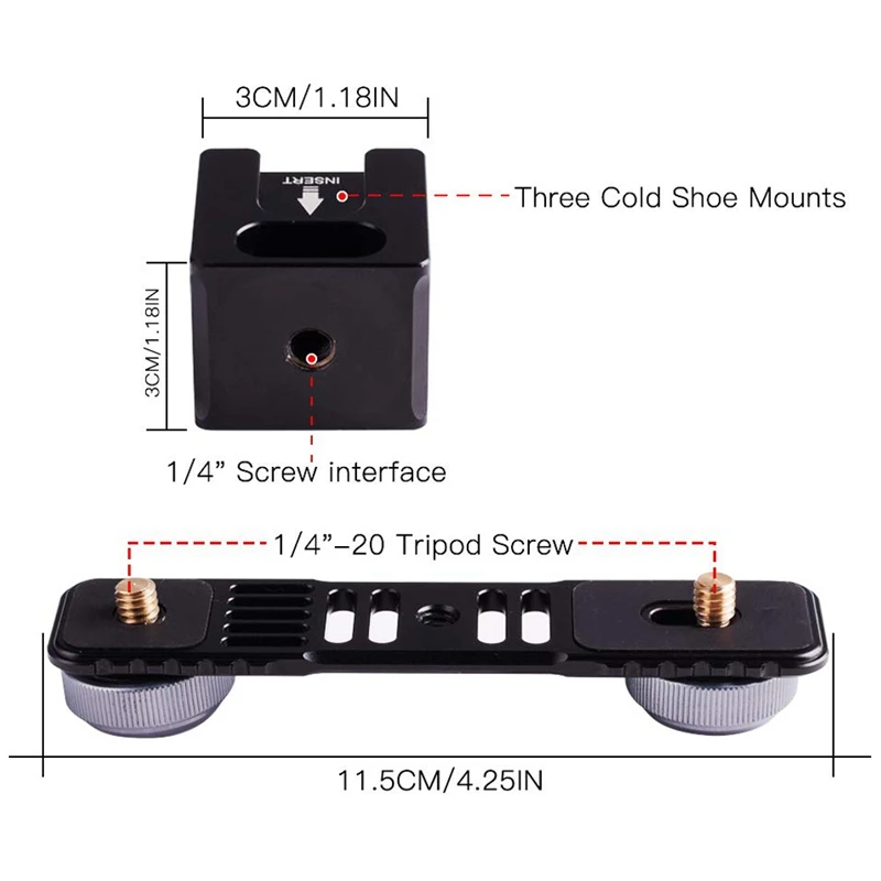 Фиксация головки холодного башмака: головка холодного башмака может быть удалена, и вы можете использовать его на другом устройстве, которое имеет винт 1/4 дюйма, стандартный горячий башмак, полностью совместим с светодиодный светильник, монитор и микрофон.