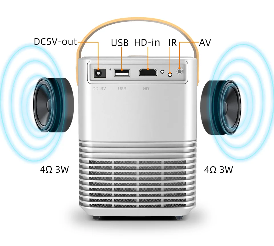 Оптические характеристики● Дисплей Технические характеристики: 4,3 ''ЖК-дисплей● Источник: светодиодный светильник, срок службы 30000 часов● Яркость: 160 ANSI люмен● Коэффициент контрастности: 1800:1● Разрешение: 800*480, максимальная поддержка 1080p● Соотношение сторон: 16:9● Отношение проектора: 1,37: 1● Размер проекта: 30-100''● Расстояние проекта: 0,94-2,84 мИнтерфейс● HD * 1;● USB (Поддержка считывания данных с жесткого диска USB SSD);● AV * 1;● DC19V-InputДругие характеристики● Динамик: 4Ω,2 Вт * 2, стерео динамик● Режим проекции: передняя/задняя/потолочная передняя/потолочная задняя● Потребляемая мощность: 55 Вт● Устройство: 140x135x110 мм● Вес: 1,5 кг![]()