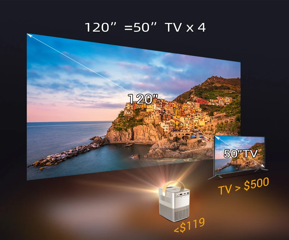 Большой экран 120 дюймовBYINTEK C720 120 дюймов <$119, ТВ 50 дюймов> $500