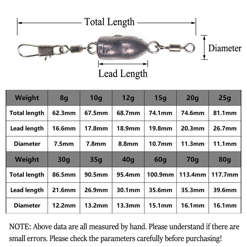 Размер: 10 г ~ 80 г (подробности как на картинке) Особенность: -Изготовлен из экологически чистого свинца, тонкой работы -Два вращающихся вертлюга из нержавеющей стали, устойчивые к коррозии -Прокатная защелка из нержавеющей стали, быстрая установка против намотки -Выполняет роль добавления веса для рыболовной группы, большой вес и Плавная конструкция легко и быстро попадают в воду. -Простое и удобное подключение, доступны разные грузила, их удобнее менять. -Полезные аксессуары, особенно подходят для Глубоководной Рыбалки. Примечание: -Все вышеуказанные данные измеряются вручную. Пожалуйста, поймите, есть ли небольшие погрешности. Пожалуйста, внимательно проверьте параметры перед покупкой! -Между фактическим весом и отмеченным весом может быть разница в 0,1-1 г, спасибо за понимание.