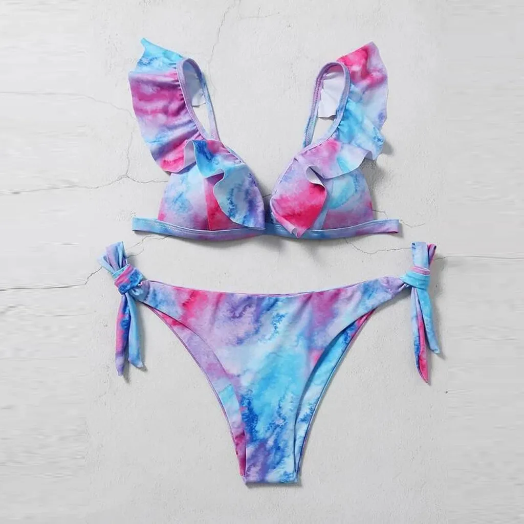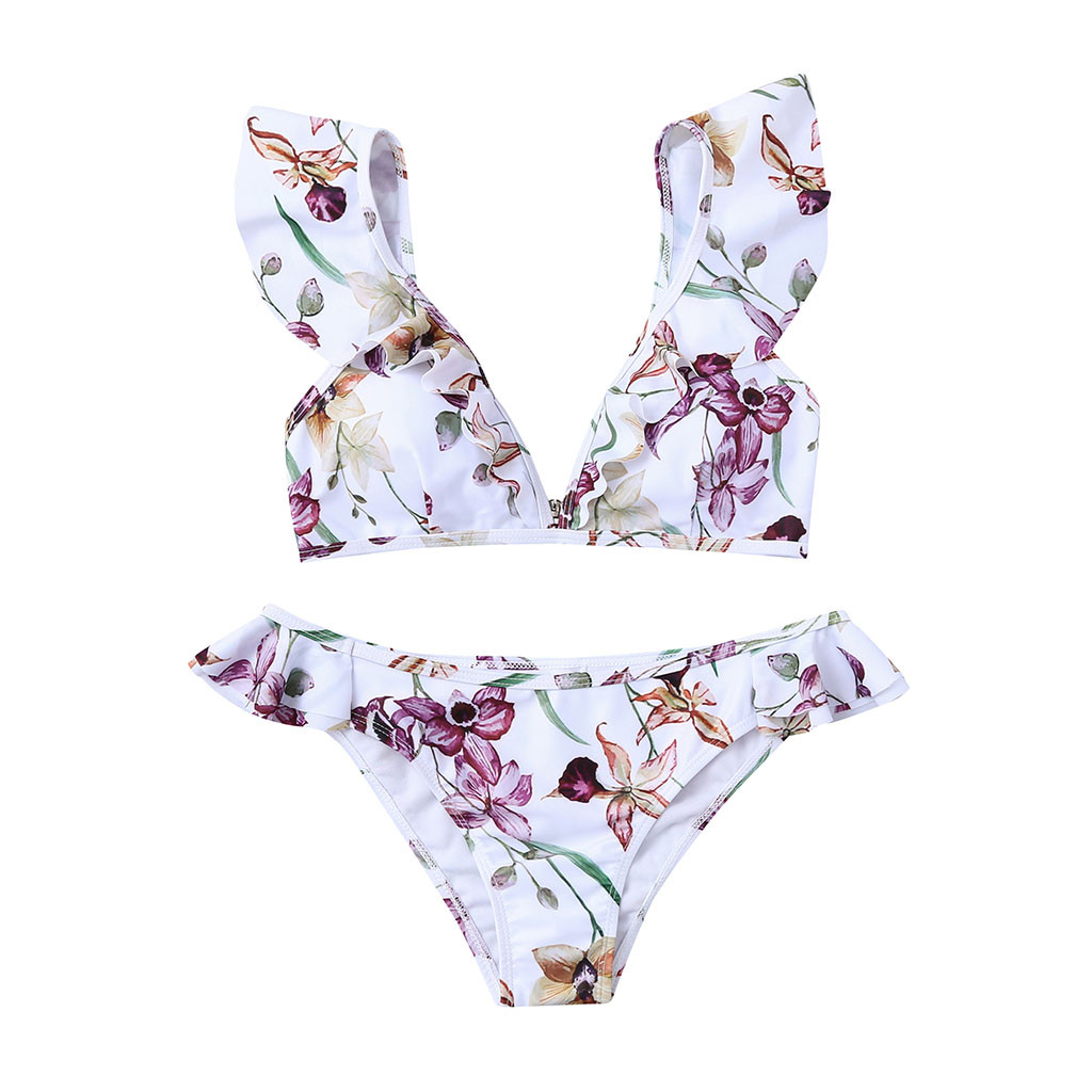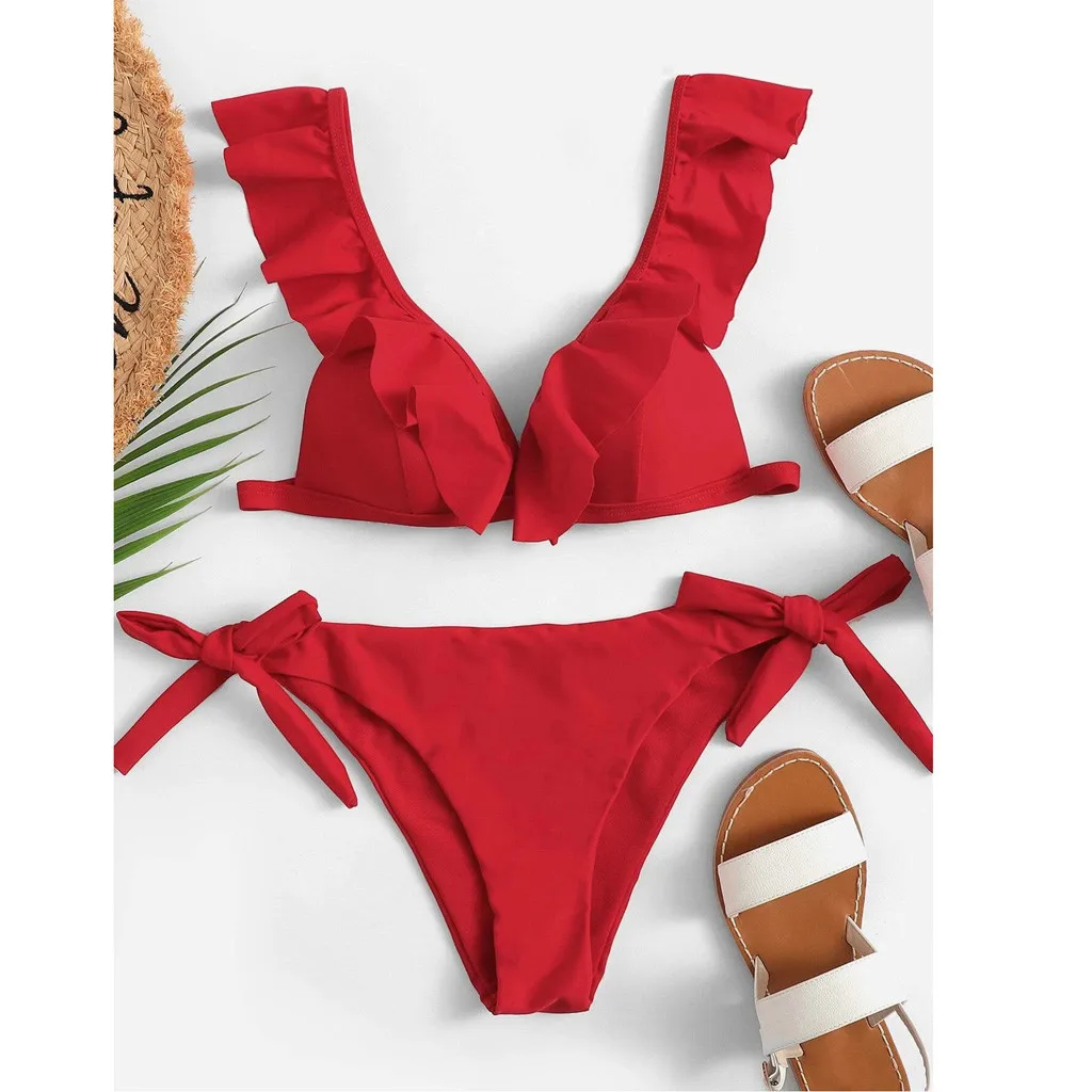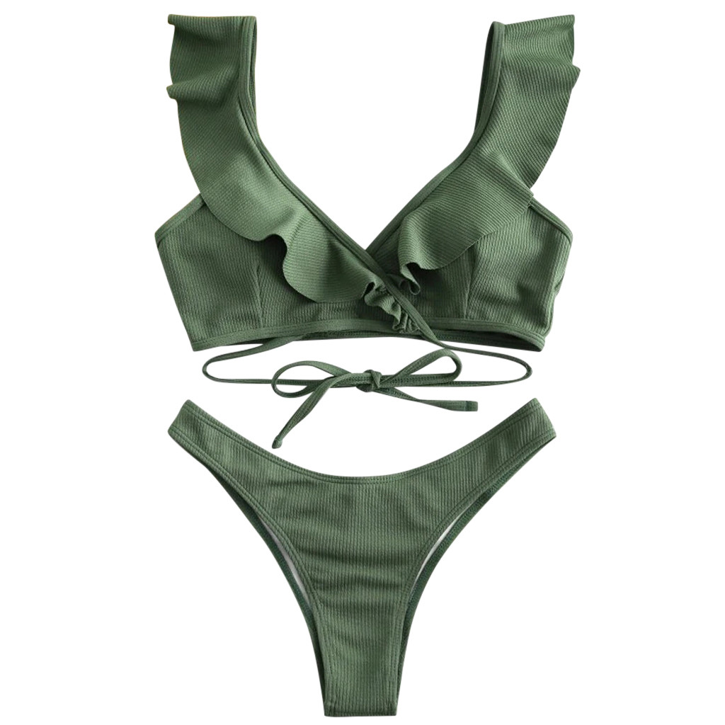 Отзывы о Женский комплект бикини с высокой талией однотонный купальник оборками женская