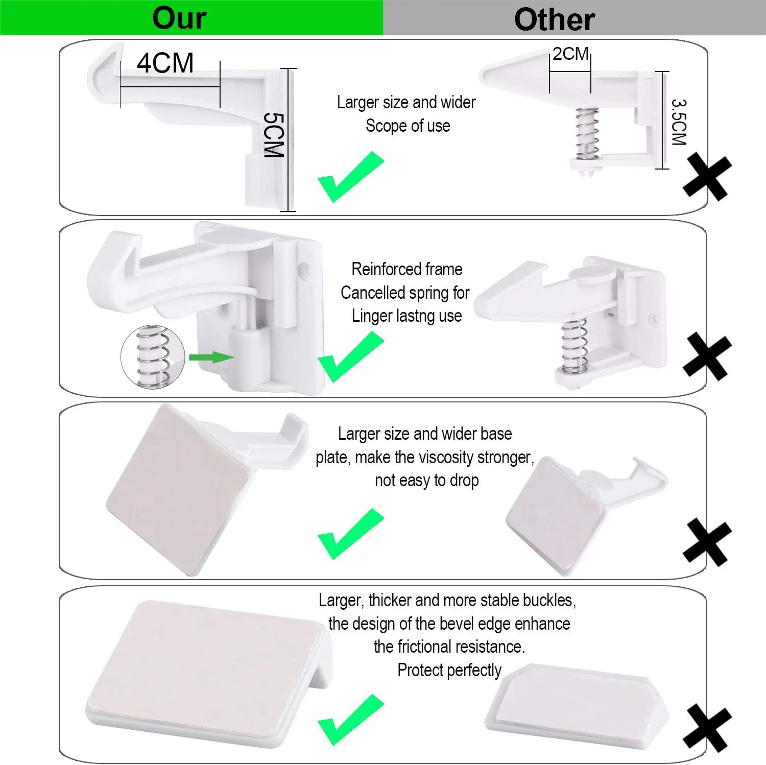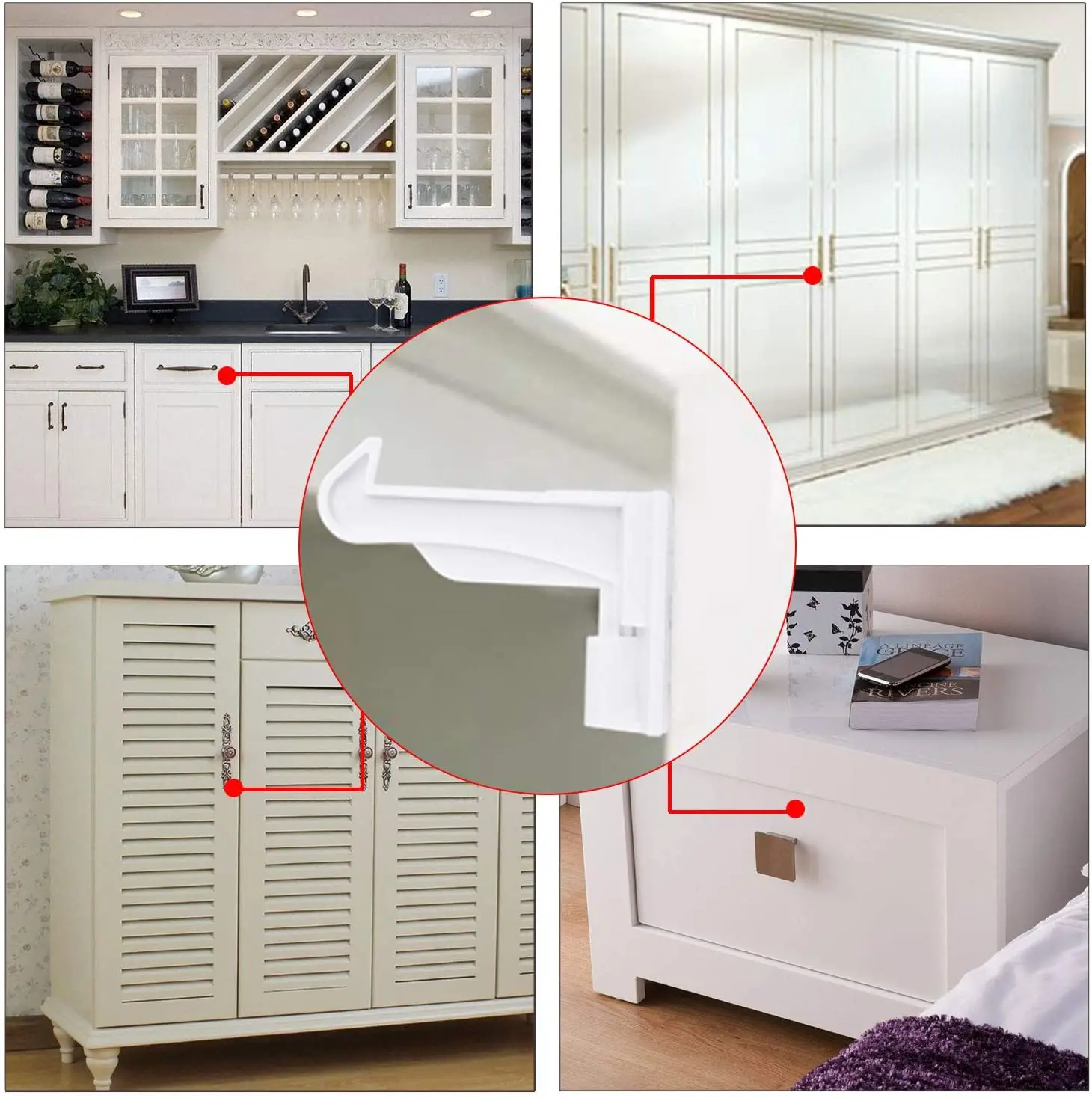 ❤❤Безопасный для вашего ребенка-эти замки для безопасного шкафа для детей держат ваших любопытных детей подальше от ящиков и шкафов, наполненных опасными инструментами или предметами, позволяя вам сохранять спокойствие, пока ваши дети исследуют ваш дом. ❤❤Нетоксичный АБС-материал-безопасные замки для детского шкафа изготовлены из нетоксичного АБС-материала, прочный, весовой, экологически чистый и не вредный для окружающей среды материал. Защитите вашего ребенка от повреждений шкафов и ящиков, заботясь о безопасности каждого ребенка. ❤❤Невидимый дизайн-эти замки для детских ящиков разработаны с невидимой пружиной, поэтому они могут эффективно предотвратить повреждение ваших рук. И детские замки находятся во внутренних ящиках, которые не привлекут внимания вашего любопытного ребенка и позволят вам избежать необходимости срывать внешний вид ваших шкафов или мебели. ❤❤Легко установить-замки для детских шкафов очень легко установить с сильным самоклеющимся клеем, не повреждая вашу мебель. И вы также можете использовать дополнительные 20 шт винтов из нержавеющей стали для фиксации на ящиках или шкафах. Просто нажмите вниз и поверните рычаг над защелкой, чтобы не запирать. ❤❤Широко используется-замки ящика безопасности ребенка поставляются с бесплатными пряжками, что делает его подходящим для различных шкафов и ящиков. Вы также можете установить их сбоку, сверху или внизу дверей шкафа, использовать их в кухонных шкафах, шкафах, ящиках, гардеробах, дверях, шкафах, И другие места с гладкой поверхностью.