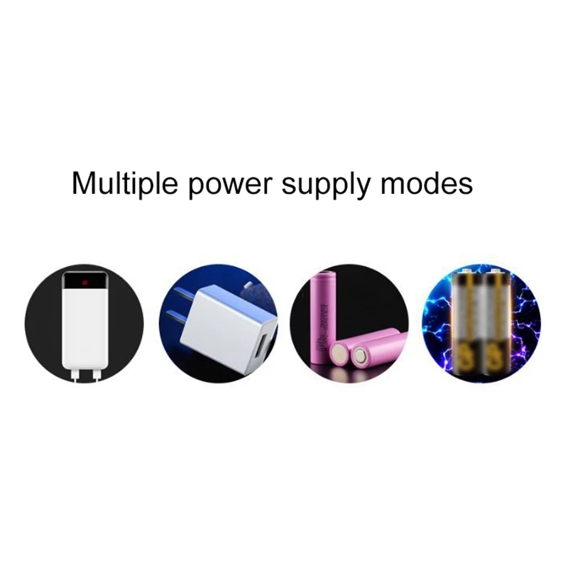 5. Доступны четыре режима питания, а именно: прямой источник питания переменного тока через USB, источник питания через зарядное устройство USB, источник питания через три обычных аккумулятора No.5 и источник питания с помощью перезаряжаемых литиевых батарей 18650.