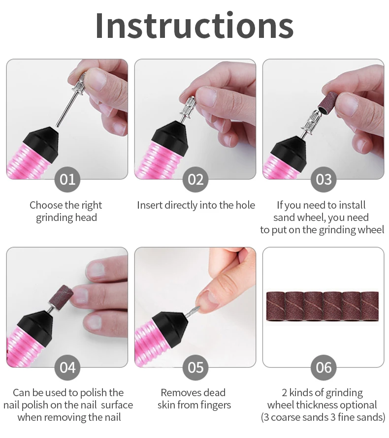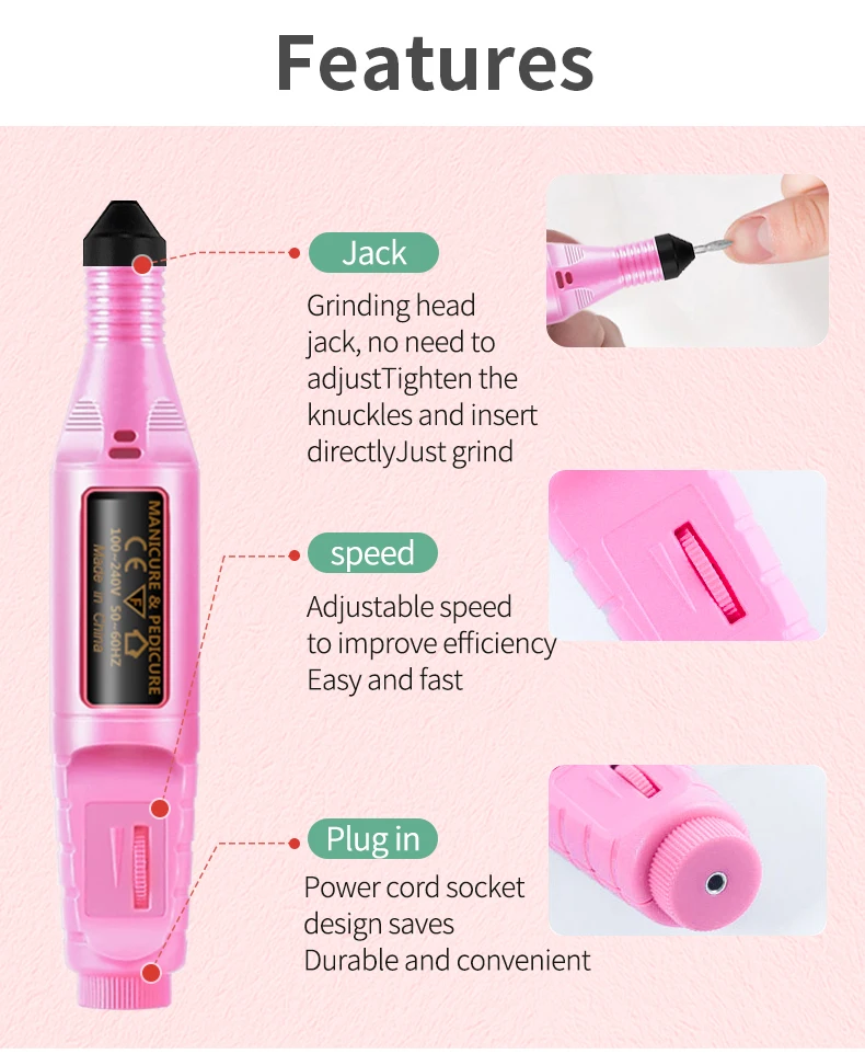 USB кабель для conveninet использованияЭлектрическая ручка для дизайна ногтей, сверлильный станок6 дополнительных бит (5 алмазных бит, 1 наждачный стержень с 6 шлифовальными лентами)Плавная регулировка скорости: 3000 об/мин до 15000 об/мин наконечник может непосредственно подключить к электричеству, легко носить с собой повсюду!Светильник-весовая конструкция для точной работы!Тихий и гладкийПодходит для педикюра и маникюраПилка для ногтей используется для натуральных ногтей, а также для искусственных ногтей