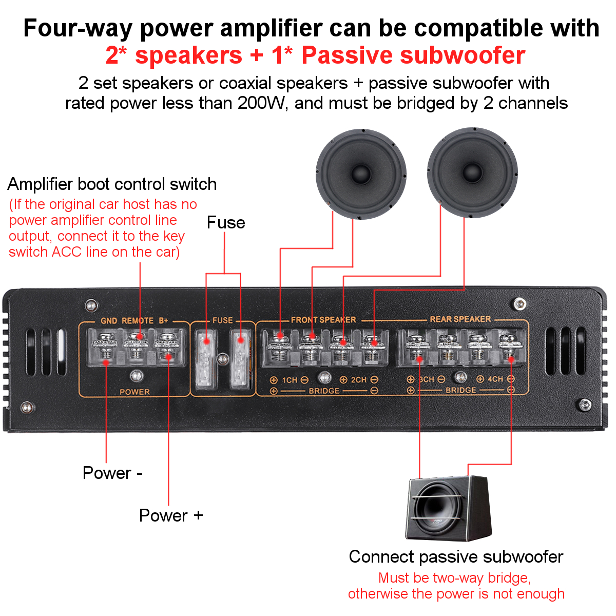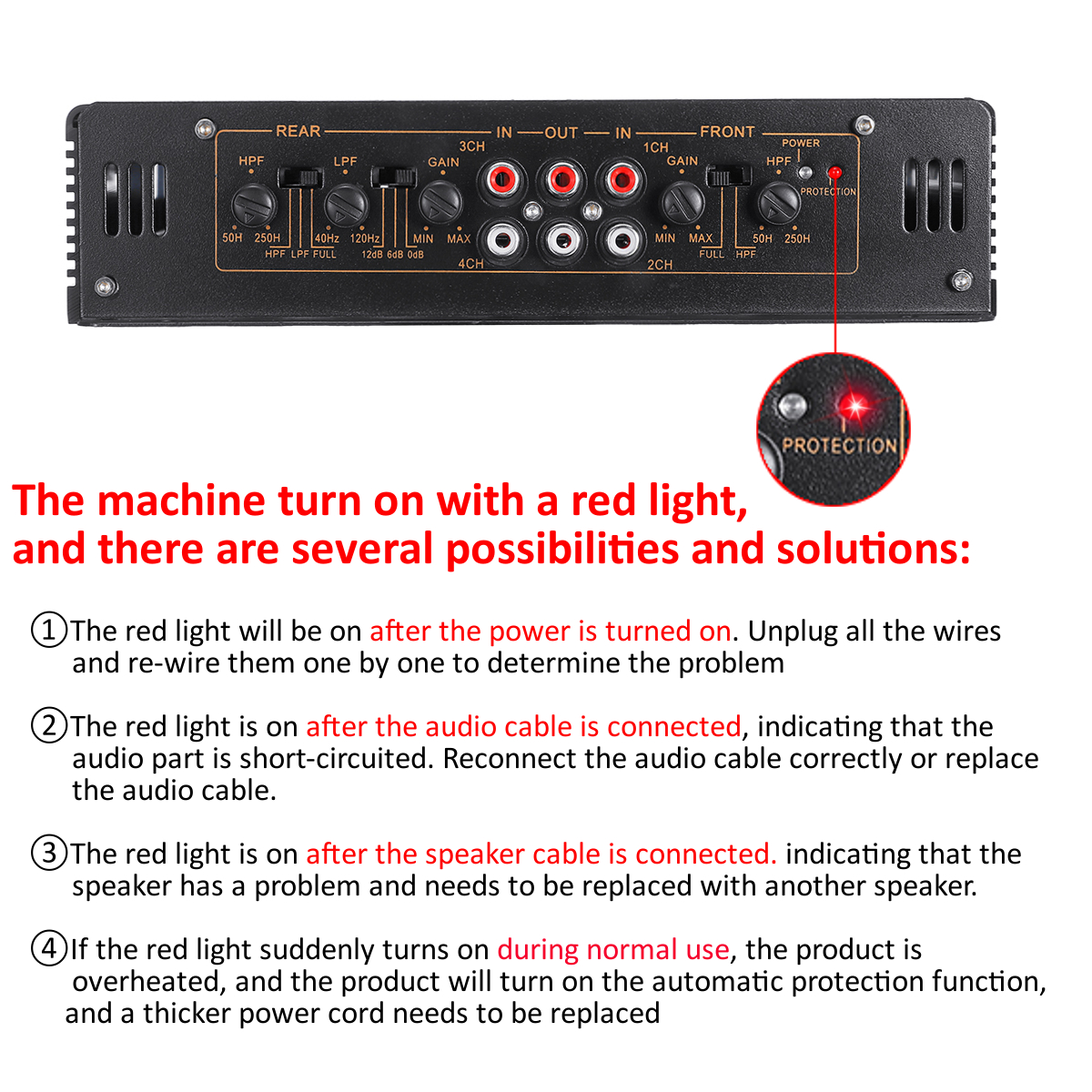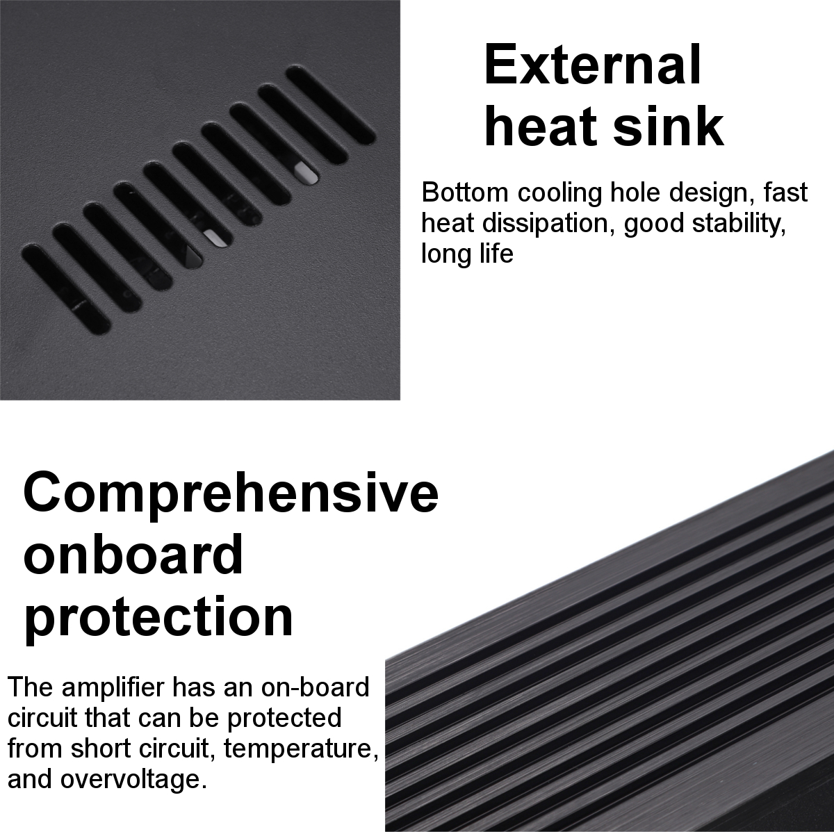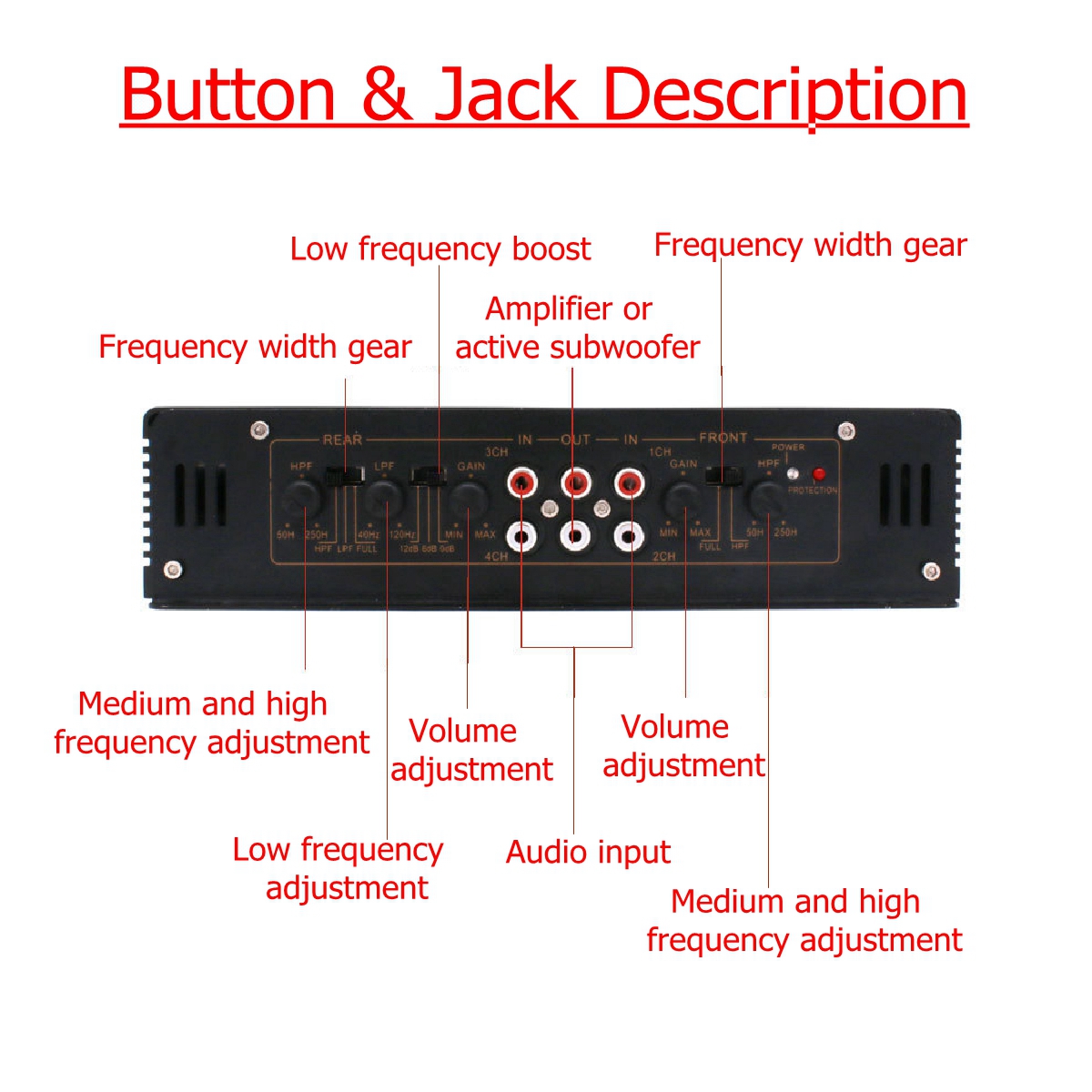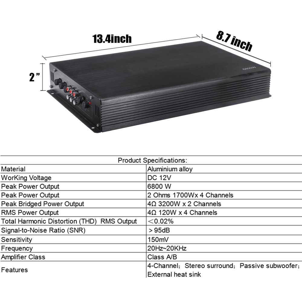 Особенности: * 4 канала 6800 Вт автомобильный Мощность усилитель * Класс усилителя: класс A/B * Стерео объемный * Основной четырехдверный динамик * Пассивный сабвуфер * Тонкий дизайн * Процесс литья алюминиевого сплава * Внешний радиатор * Термозащита от перегрузки и короткого замыкания динамика