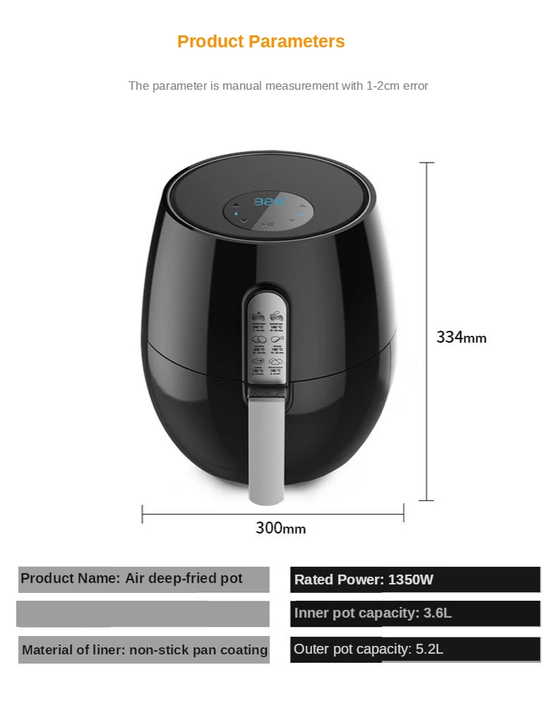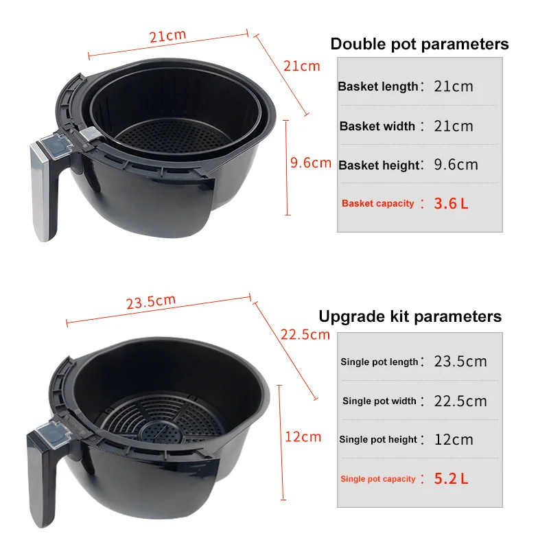 Напряжение: 120-230 В Мощность: 1350 Вт Режим управления: Интеллектуальный сенсорный экран Выбор режима: точный контроль температуры Емкость жареной корзины: 3,6 л Емкость кастрюли: 5,2 л Сценарий применения: кухня Вилка: вилка США/ЕС Посылка включает в себя: 1 Воздушная фритюрница 1 x антипригарная корзина 1 x Руководство пользователя