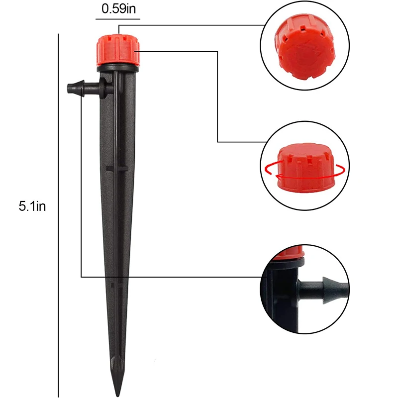 √ С 1/4 "кольцом, чтобы подключить к земле и удерживать сопло на месте. √ Распылитель рассеяния, 8 выходов. √ Отрегулируйте поток путем скручивания сопла. √ Быть скрученным закрытым, чтобы выключить. √ Крышка снимается для легкой очистки. √ Поставляется со встроенным стержнем, так что вы можете легко подключить 1/4 "капельная трубка.