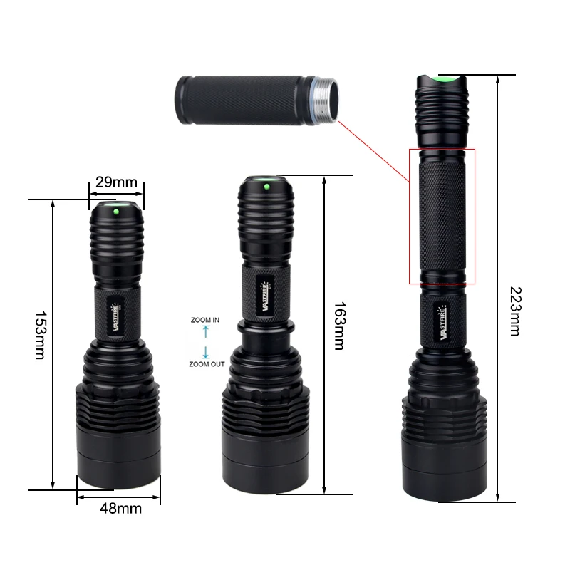 Размеры: 223 мм (уменьшение зума + 10 мм) (длина) / 48 мм (головка)/25,4 мм (корпус) / 29 мм (хвостик)