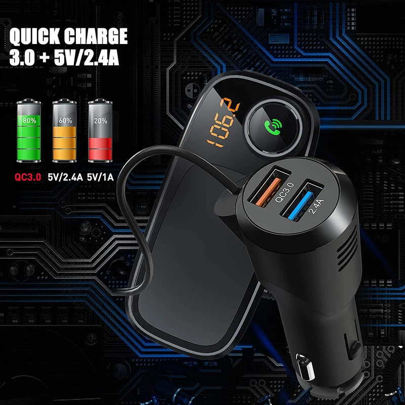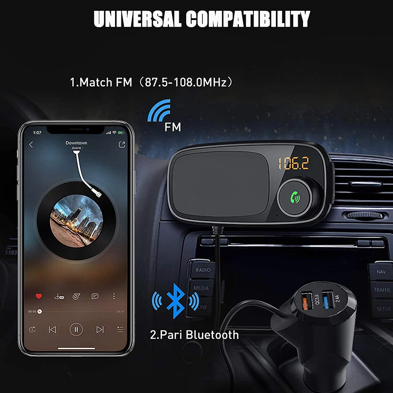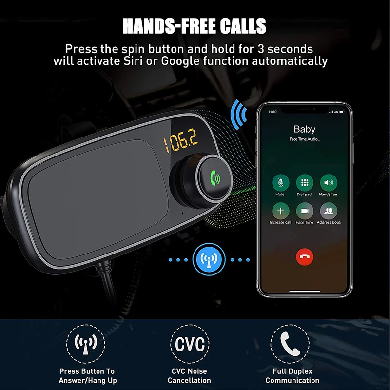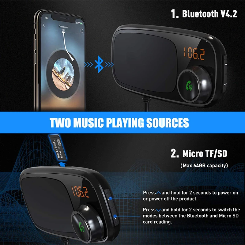 Особенности: Двойной выход USB: быстрое зарядное устройство QC3.0; 5 в постоянного тока/2,4 А Поддержка воспроизведения музыки с карты TF (Micro SD) Громкая связь Bluetooth: ответ/повесить трубку/Повторный набор Частотный диапазон: от 87,5 МГц до 108 МГц Диапазон действия Bluetooth: от 2 до 5 метров Поддержка функции Siri: Скажите «да» или «нет», чтобы ответить/повесить звонок Посылка 1 х FM модулятор 1 х Руководство пользователя (без розничной коробки)