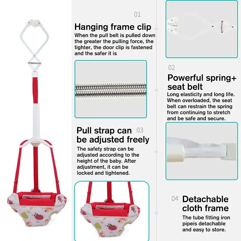 Легкая оправа легко снимается и надевается, а лямки регулируются для идеального роста по мере роста ребенка. Дверной зажим для перемычки надежно крепится к большинству дверей и имеет уникальный дополнительный ремешок для дополнительной безопасности. Крепкий зажим дверной рамы обеспечивает надежное прилегание к дверным проемам. Мягкое кольцо для сиденья для комфорта ребенка. Ремни позволяют регулировать рост ребенка. Опорная подушка для поддержки. Легкая рама для портативности. Коврик для сиденья легко чистится. Никаких инструментов для сборки! Дополнительный ремешок для дополнительной безопасности.