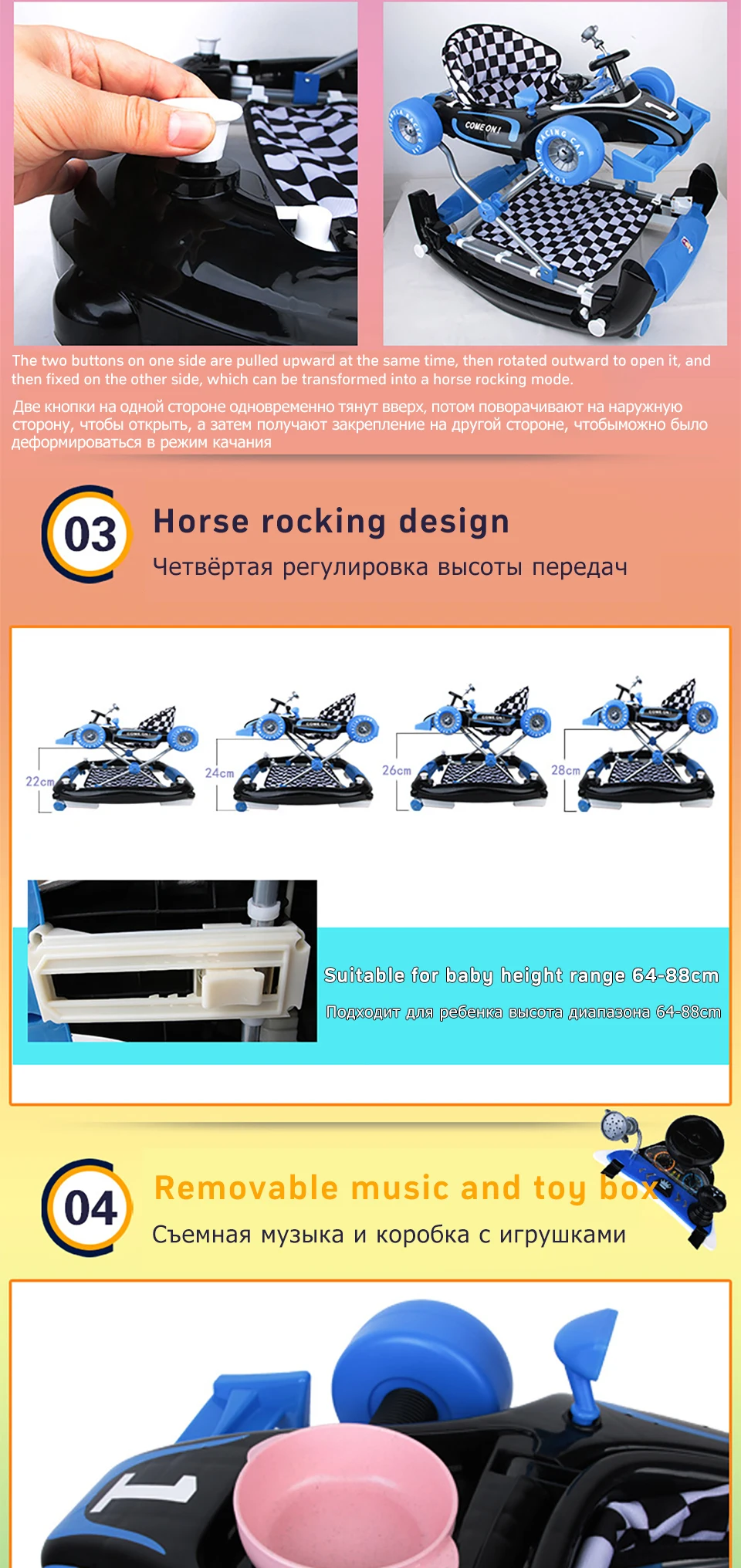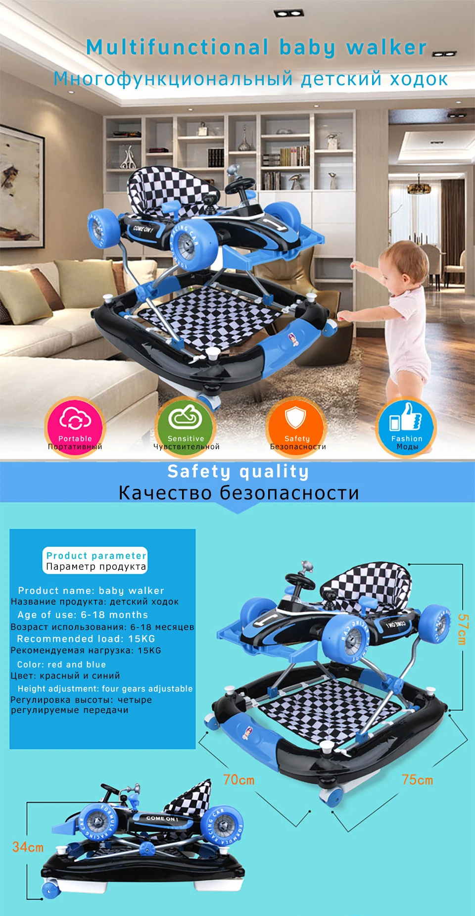Описание продукта: 1. Подходит для 6-24 месяцев 2. С толстой алюминиевой трубкой, несущая способность сильна и очень стабильна. 3. Используйте полипропиленовый пластик. Безопасный и нетоксичный, легко чистится 4. Используйте 4 колеса, которые могут вращаться на 360 градусов. Эффективно гарантирует стабильность транспортного средства