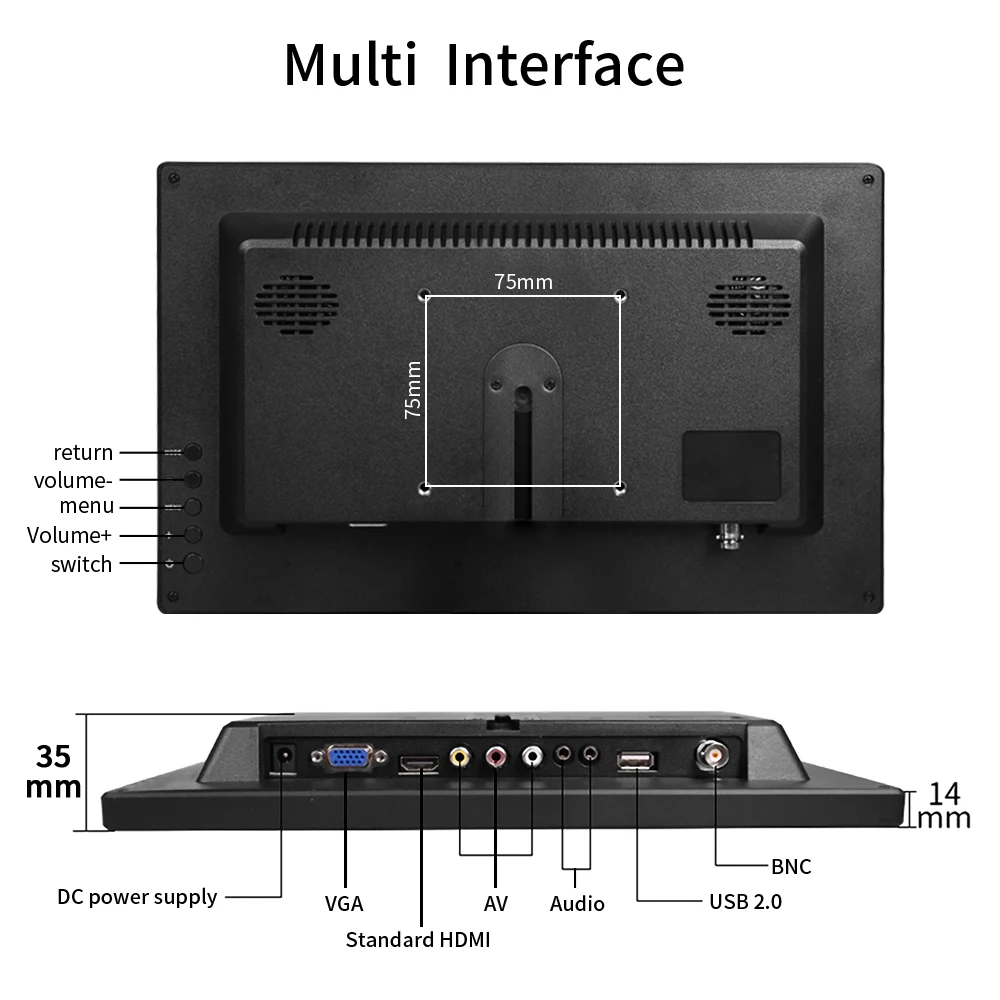 Как классический монитор, он не только имеет отличные функции отображения, но также имеет небольшой и компактный дизайн, который позволяет положить его в сумку для путешествий в любое время, в любом месте и в любое время, где угодно.1. Широко используется в офисе, развлечений и наблюдения.2. Подходит для PS4/PS5/XBOX/Switch/Raspberry Pi/мобильный телефон/автомобиль/Охрана дома имитатор света телевизора/ТВ телеприставка.3. Встроенные двойные динамики.4. Используйте HDR, чтобы сделать цвет дисплея более ослепительным.5. Его задняя часть оснащена 75X75 отверстиями для настенного крепления, который используется для установки автомобиля и стены.6. Двойной интерфейс HDMI.7,5 VUSB и DC12V источник питания