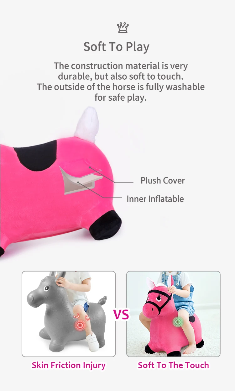 Плюшевая подкладка Высокое качество: поверхность скакалки покрыта плюшем (Превосходный хлопок и нетканый материал) внутри изготовлена из чрезвычайно прочного экологически чистого материала. Мягкая резина не содержит США запрещенных фталатов и тяжелых металлических элементов. Соответствует требованиям безопасности ЕС EN71, США CPSIA и ASTM F963. Безопасно играть. Экологически безопасный высококачественный резиновый материал делает этот батут безопасным и веселым для ваших детей. Стимулирует активные игры и Развивает координацию рук и глаз. Надувной и стабильный 4 ноги пространство бункера: легко надутия: выньте вставлен белый вилка американского стандарта (воздушный затвор) от отверстия на лошади живота; вставьте наконечник насоса и надуйте Хоппер до хорошего размера, затем быстро Замените белую вилку обратно в отверстие. Имеет дополнительные длинные уши для легкого захвата и является правильным ростом, чтобы отточить эти навыки балансировки и координации, обеспечивая забавную тренировку. Он будет отлично смотреться в любой игровой комнате. Надувная езда на пони устойчивая и толстая, но мягкая и весит светильник. Отличный подарок на день рождения или Рождественский подарок для унисекс, младенцев, мальчиков, девочек, детей ясельного возраста и дошкольников. У нас есть больше цветов и стилей для малышей, чтобы легко отличить животных, лучший обучающий ресурс. Игрушка обеспечивает обучение, Образовательное мышление, распознавание формы, решение проблем, общение, социальные навыки, творчество, координацию рук и глаз, спорт, игры и жизненные навыки. Время выпустить животных! Эта надутая игрушка-это не просто любая игрушка, это настоящая надувная езда на приятеля, которую ваши дети полюбят! Легко использовать, просто надувать, хватать на длинные, легко хватать уши, и от вас! Подходит для весенних туров, летних каникул, осенних видов спорта и игр на открытом воздухе. Ваш ребенок может почувствовать себя на лошади. Отлично подходит для вечеринок и занятий в помещении! Дети любят красочный дизайн и быстро учатся сидеть и прыгать вперед, развивая баланс и координацию. Есть четыре стиля (Зебра, корова, лошадь и собака) несколько цветов (коричневый, желтый, черный, белый и розовый) на выбор. Это одна из лучших игрушек для здоровых потребностей молодых развивающих малышей, которые способствуют здоровым упражнениям, веселью и радостью. Играйте на лужайках, патио, гостиных, детских садах, детских садах и игровых комнатах для развития воображения.