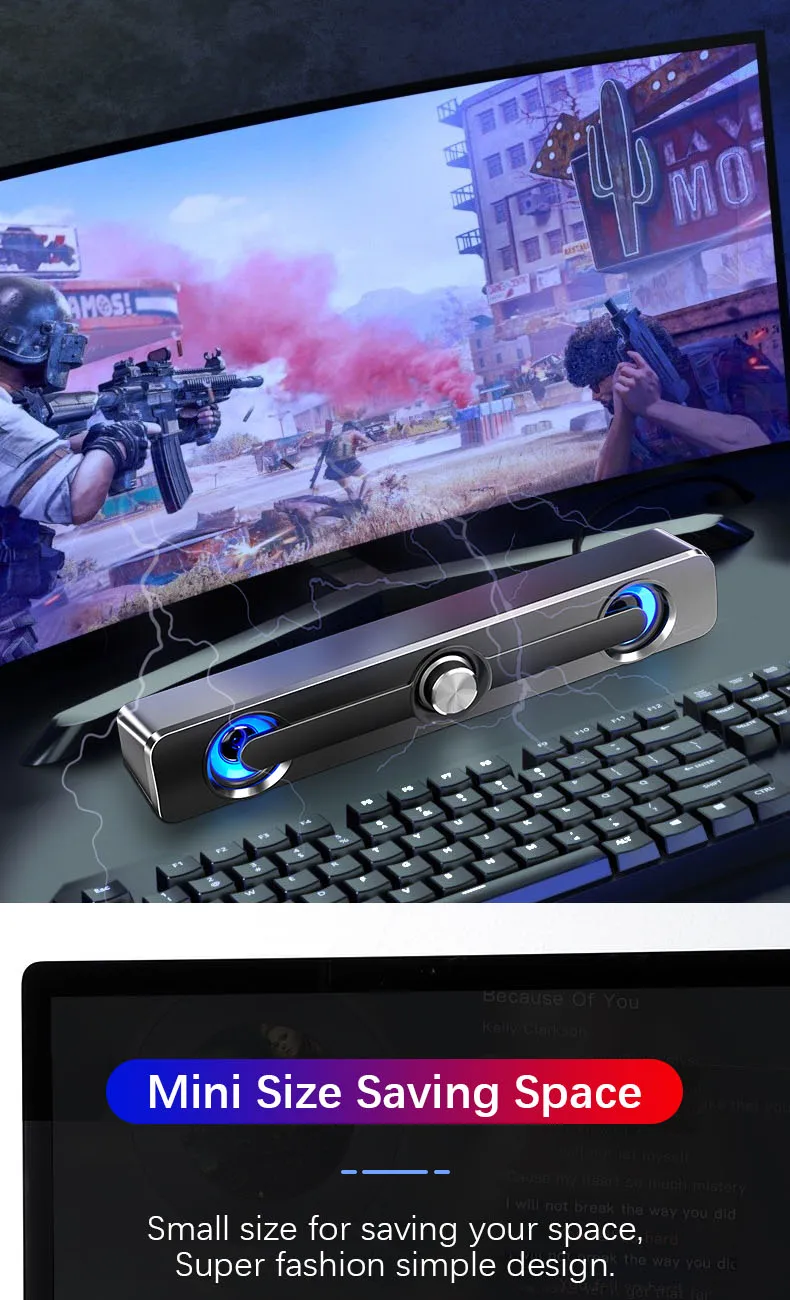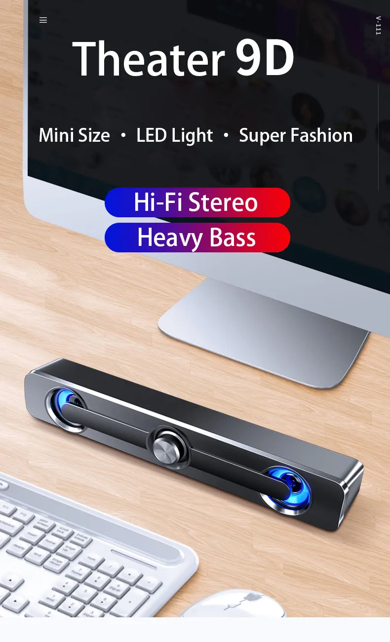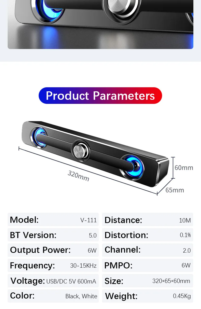 ПримечаниеДорогой друг, обе версии имеют питание от USB, поэтому независимо от Проводной Версии или версии Bluetooth все с проводом. Но Проводная версия имеет только проводную функцию, версия Bluetooth-Bluetooth + Проводная. Поэтому, если вам нужен Bluetooth, пожалуйста, выберите версию Bluetooth. Спасибо. Важно!Если вы выбираете версию Bluetooth, то динамик с Bluetooth доступен. Если вы не знаете, как подключаться по Bluetooth, пожалуйста, напишите нам. Но если вы не выбираете версию Bluetooth, она не может подключаться по Bluetooth. Как подключить BluetoothПодключите usb-кабель, а затем нажмите кнопку в середине динамика, она включит режим Buetooth или AUX, в режиме Bluetooth, откройте Bluetooth телефона и найдите динамик, чтобы перейти по ссылке. Или вы можете связаться с нашей службой поддержки клиентов, оставьте нам сообщение и ваш адрес электронной почты, мы можем отправить вам видео. 9D стерео звукС качеством объемного звучания 360 градусов, 2 динамика и 2 воздуховода, 4 единицы звука, стереогромкость 4D, вы можете наслаждаться уровнем кинотеатра и высоким качеством звука. Освещение ледяного пламениКрутой синий светильник полон металлического ощущения, простой дизайн линии и красивый корпус делают повседневное прослушивание песен искусством. Простота в использованииЗвуковая панель с питанием от USB (5 В), с 3,5 мм функции plug and play, без каких-либо дополнительных программное обеспечение не требуется. Просто подключите его к 5V источника питания и подключения 3,5 мм штекер к устройству, Увеличьте громкость и наслаждаться музыкой. Необыкновенное качество звукаПрименение 30 градусов наклона технологии для того, чтобы уменьшить проблему вибрации, низкой частоты для большей точности, ВЧ чёткие и звучание басов и более мощный и возможностью прослушивания музыки не ограничено. Широкая совместимостьЗвуковая панель поддерживает большинство устройств со стандартным 3,5 мм гнезда. Совместим с ПК, компьютером, ноутбуком, планшетом, смартфоном. Независимый регулятор громкостиПоверните кнопку, чтобы контролировать громкость, легко управлять. 2 режима воспроизведенияРазработан с технологией DSP, поддерживает 2 режима воспроизведения, включая Bluetooth, AUX Line in. Технология шумоподавления DSPG-Level anti-magnetic технология используется для защиты от помех мобильных телефонов и компьютерsoffer высокого качества звука. ПараметрыМодель: V-111Цвет: черный, белыйВерсия Bluetooth: 5,0Расстояние Bluetooth: 10 мВыходная мощность: 6 ВтИсточник питания: USBСпособ подключения: AUX 3,5 мм аудио разъемЧастота: 30 Гц ~ 15 кГцКоличество динамиков: 2Канал: 2,0Освещение: ПоддержкаРазделение: 35 дБОтношение сигнал-шум: 65 дБИскажение: 0.1%Напряжение: DC5V-600mAМатериал корпуса: пластикРазмер упаковки: 320*65*60 ммВес изделия: 0,45 кгУпаковочный лист1 * динамик1 * Руководство пользователя