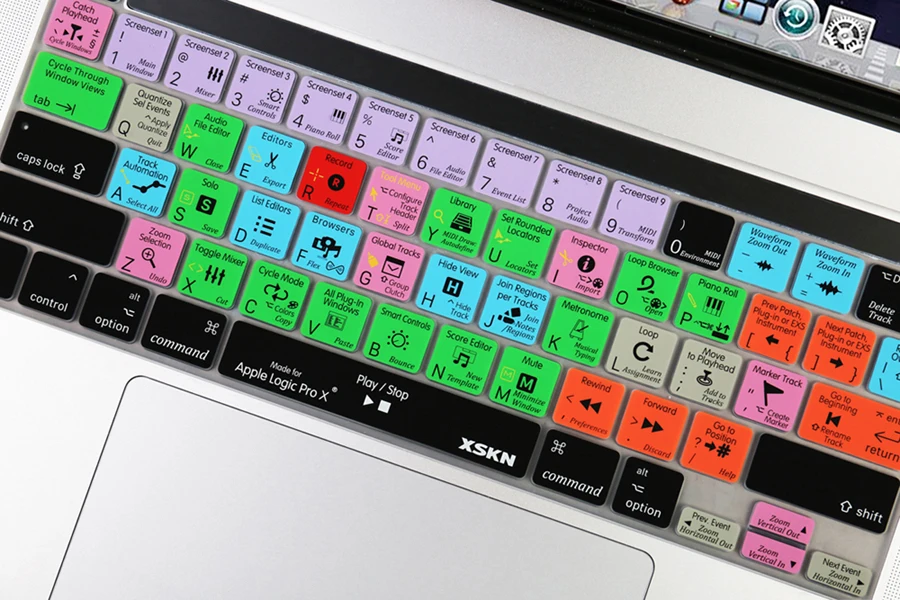 2)Предоставляет быстрый дизайн QWERTY character layout на английском языке для Apple Logic Pro X, подходит для пользователей Logic music edit, с обложками Logic Pro X, вы можете ускорить рабочий процесс и закончить проекты быстрее и проще. Особенно те, которые не знакомы с горячими клавишами, помогают повысить эффективность работы