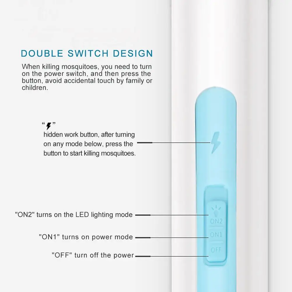 6. Двойной переключатель: Включите выключатель питания, чтобы убить комаров, затем нажмите и удерживайте кнопку работы. Двойная защита, предотвращает случайное прикосновение членов семьи или детей.