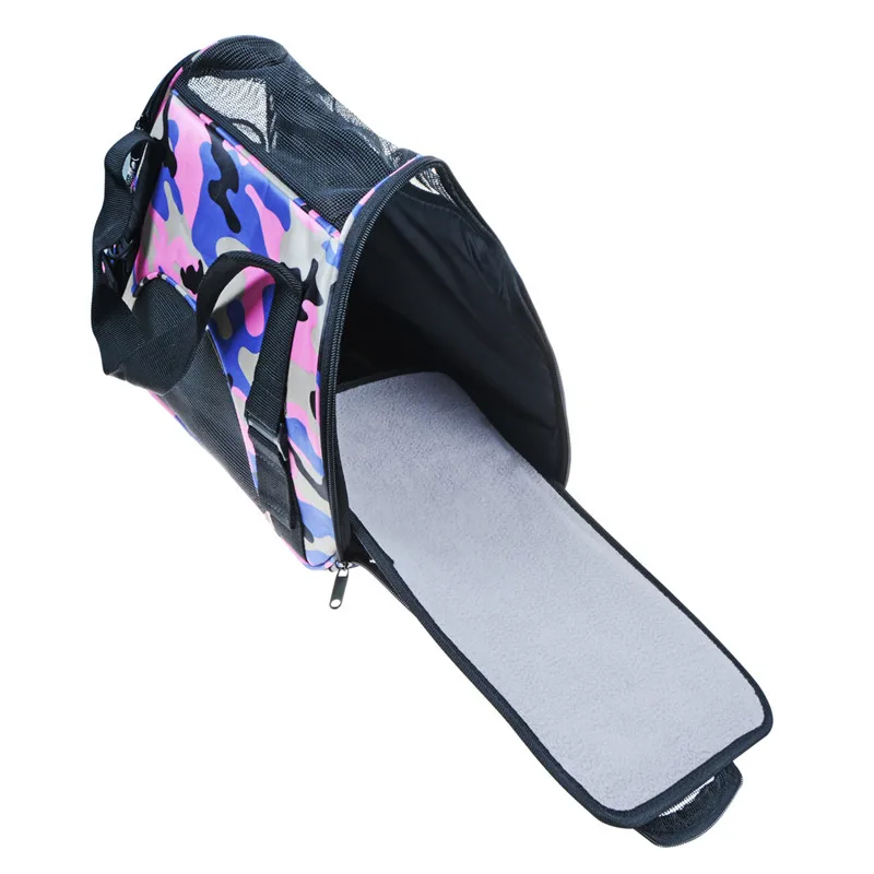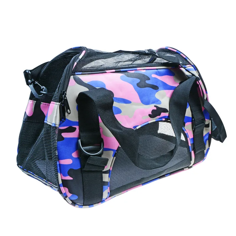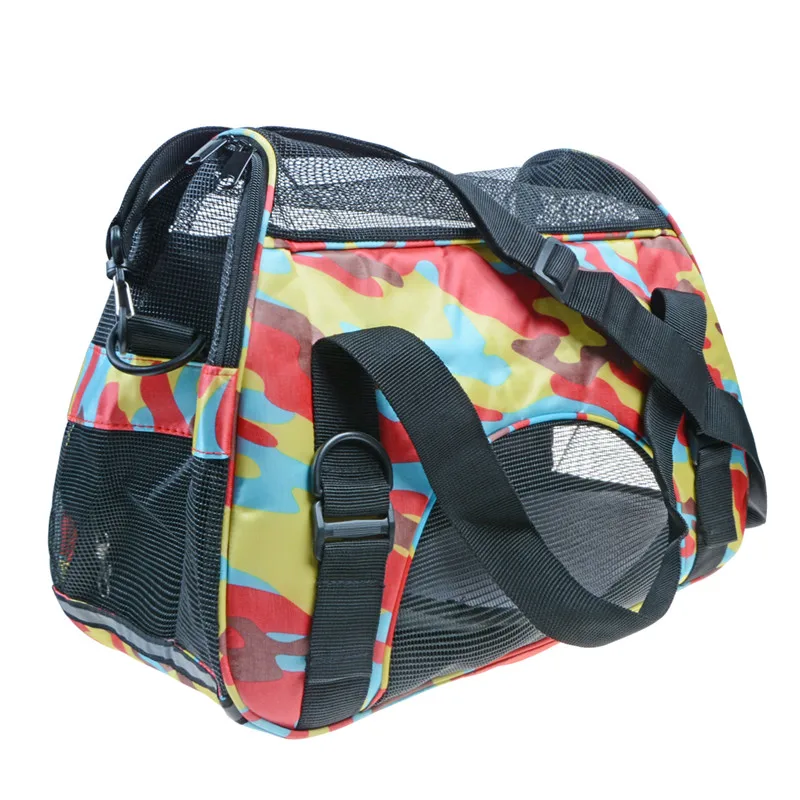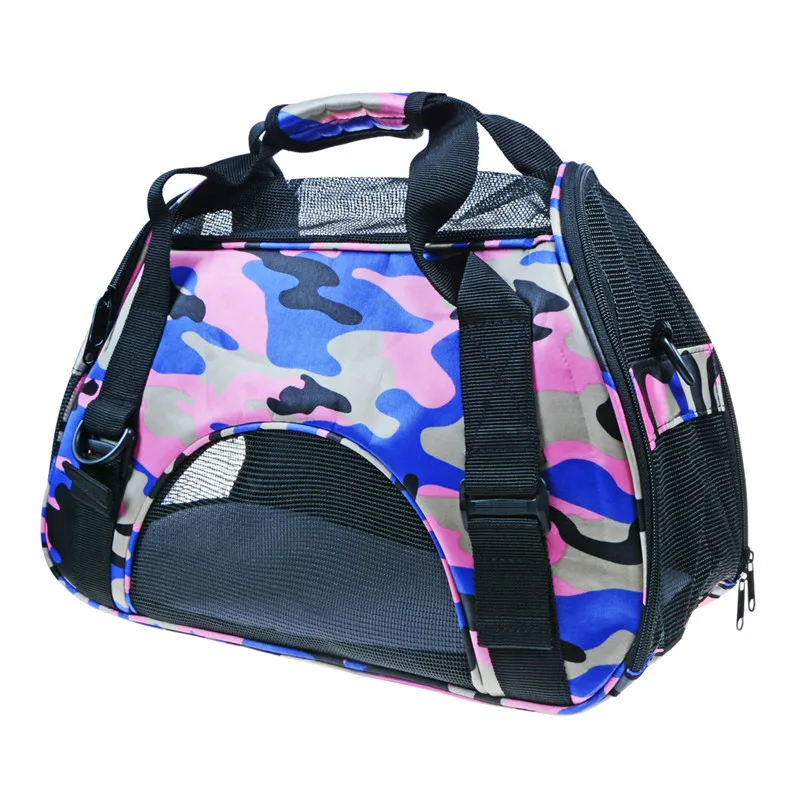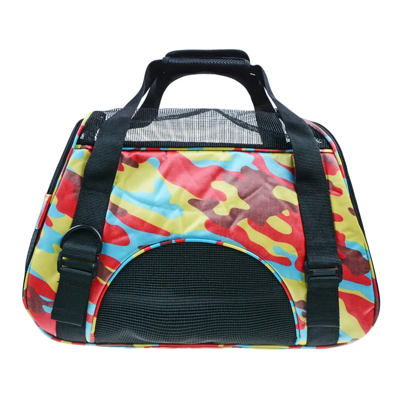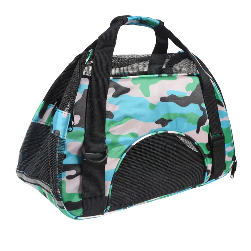 Особенности: * Стильный и красивый. * Ношение и долговечность. * Легко чистить. * Подходит для маленьких домашних животных. * Хорошо вентилируемый и современный дизайн. Спецификация: Цвет: красный/синий/зеленый камуфляж Материал: из искусственной кожи Количество: 1 шт. Вес посылки: 0,85 кг Посылка включает: 1 * дорожная дышащая сумка для домашних животных