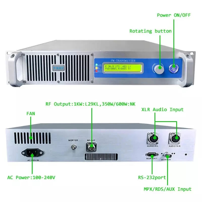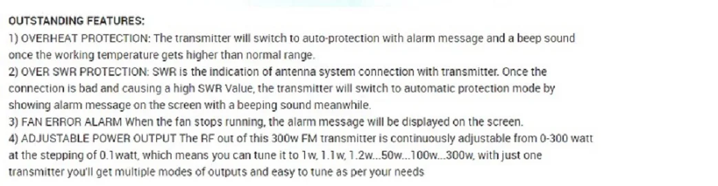 · Передатчик реализует цифровой модулятор FM в качестве своего ядра, сочетая с усилителем мощности RF. В передатчике DSP и DDS используются для выполнения полностью цифровой обработки, такой как цифровая фильтрация, предварительный акцент, генерация пилотной частоты, стерео кодирование и FM Модулирование. Цепь AGC используется для поддержания стабильной мощности. · Высокая производительность и очень хорошая надежность были подтверждены большим использованием YXHT-300C передатчиков. Также это низкая стоимость и небольшой Размер.