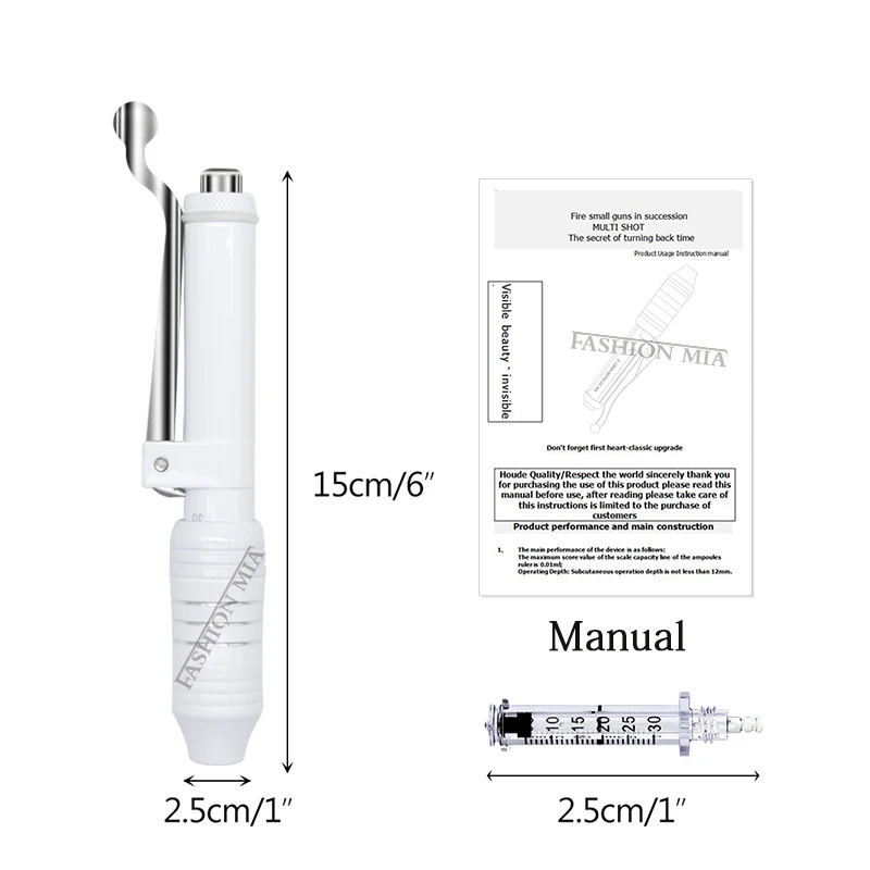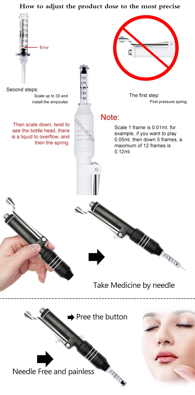 Различные стили имеют разную глубину впрыска, чем больше глубины-это новый обновленный стиль. Это хорошо для использования, лучший эффект. Описание продукта: Тип: ручка с гиалуроновой кислотой Особенность: удаление сосудов, омоложение кожи, темные круги, удаление морщин, потеря веса, увлажнение, отбеливание, увлажнение Сертификация: медицинский CE / ISO13485 / RoHS Материал: нержавеющая сталь 316 (Профессиональная Медицинская нержавеющая сталь) Объем впрыска: 0,01 мл ~ 0,12 мл (Минимальная шкала 1 рамка составляет 0,01 мл, если вы хотите играть 0,05, то вниз 5 кадров, максимум 12 кадров составляет 0,12 мл, самый большой объем-0,3 мл) Режим работы: распыление под высоким давлением Размеры: 8,2*6,6*3,2 см и 450 г Принцип действия: Пружина и поршень, которые позволяют, под давлением, быстро и равномерно вводить наркотики под кожу через отверстие диаметром 0,1 мм, что в два раза меньше толщины иглы для инъекций! С помощью энергии механического действия пружина и специальный поршень в аппарате позволяют под давлением быстро, но мягко проталкивать поток препарата через Микроскопическое отверстие в подкожную ткань. Препараты усваиваются гораздо лучше и быстрее, чем с введением иглы, что подтверждено чередой исследований и тестов, проводимых в разных странах мира. Идеальное решение для склонных к рубцам и подкожным тромбам. Преимущества гиалуроновой ручки: * Безболезненная инъекция * Инъекция без иглы исключает риск заражения из иглы * Не оставляет шрамов и проколов ткани кожи с помощью иглы * Лучшее и более быстрое усвоение лекарств * Строго Подкожная инъекция-устранение риска проникновения препарата в мышцу * Быстро, легко и безопасно * Раздельное и экономичное дозирование препарата Качество: 1. Вопрос: какой объем впрыска? Ответ: объем впрыска составляет 0,01-0,12 мл, Минимальная шкала 1 рамка составляет 0,01 мл, если вы хотите играть 0,05, то вниз 5 кадров, максимум 12 кадров-0,12 мл, самая большая шкала-0,3 мл 2. Вопрос: Привет, могу ли я использовать все фирменные наполнители для губ с этой гиалуроновой ручкой? Ответ: Да, вы можете использовать все фирменные наполнители, например, для похудения лица, для удаления морщин, для удаления черных кругов, для красоты, для губ и т. д. Примечание: Если вы не могли использовать гиалуроновые наполнители (или другие косметические средства) раньше, вам не лучше консультироваться с косметологом.