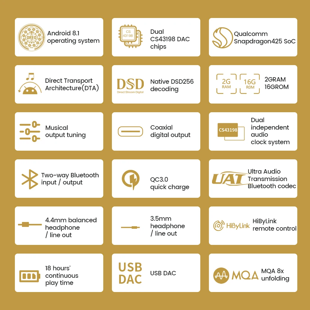 Команда HiBy со своим сильным программным обеспечением оптимизировала систему Android 8,1 для идеального воспроизведения бит, используя систему DTA для обхода передискретирования аудиостека Android для идеального звука в масштабе всей системы, В то же время поддерживает практически все приложения Android, что обеспечивает ощущение работы со смартфоном и превосходит их производительность звука.