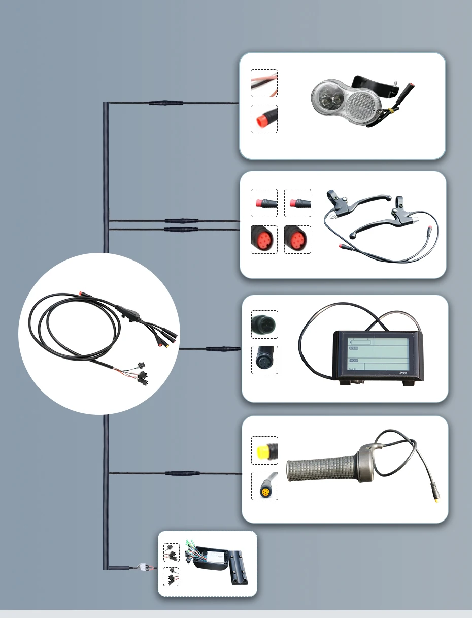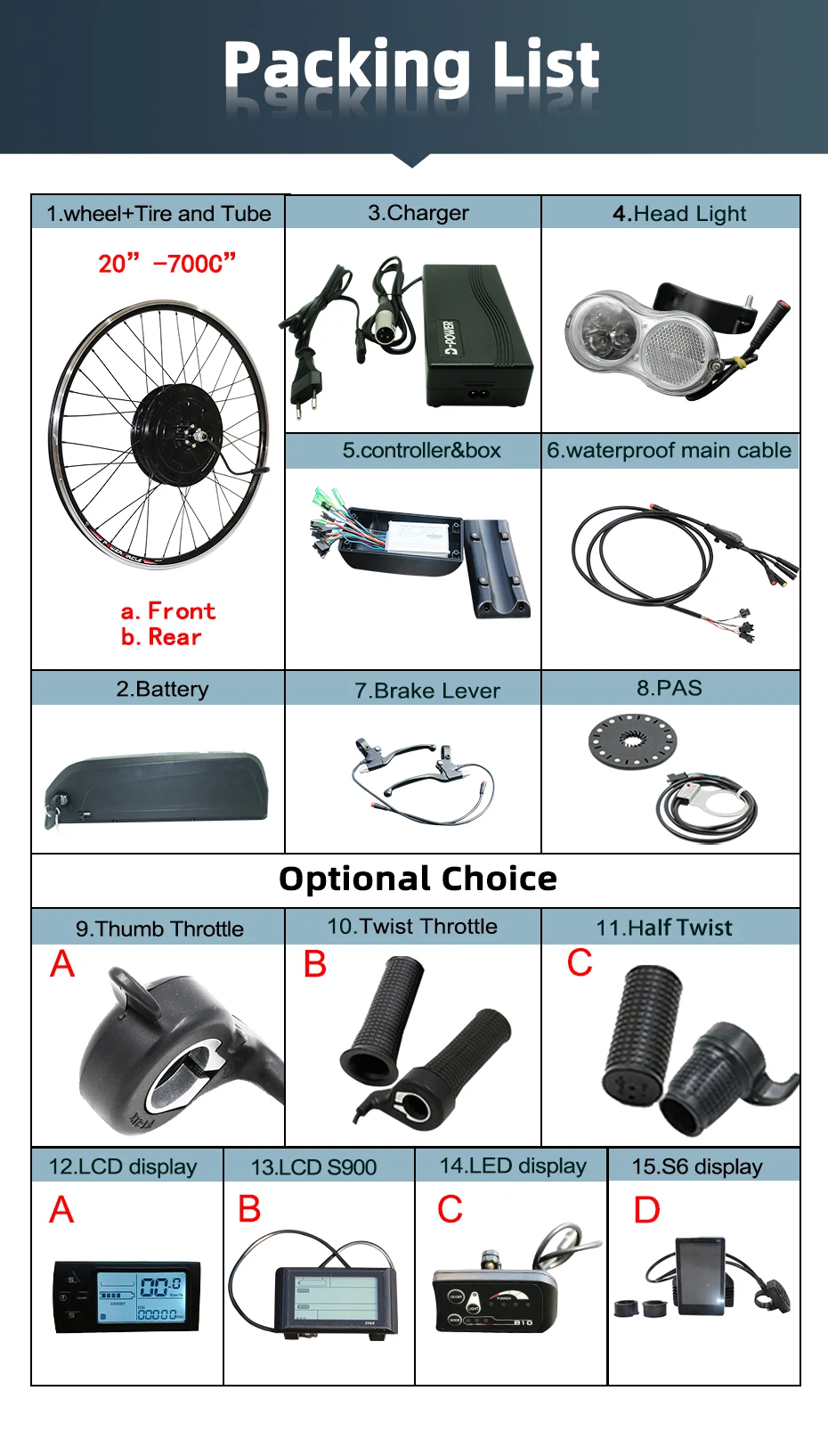 1. Колесо + шина и трубка (переднее колесо, заднее колесо, 20 "24" 26 "27,5" 700C29 ") 2. Аккумулятор 3. Зарядное устройство 4. Передсветильник 5. Контроллер и коробка 6. Водонепроницаемый основной кабель 7. Рычаг тормоза 8. PAS На выбор: 9. Рычаг тормоза: дроссельная заслонка большого пальца, поворотная закрутка, наполовину поворот 10. Doisplay: ЖК-дисплей, LCD S900 светодиодный-дисплей, S6 дисплей.