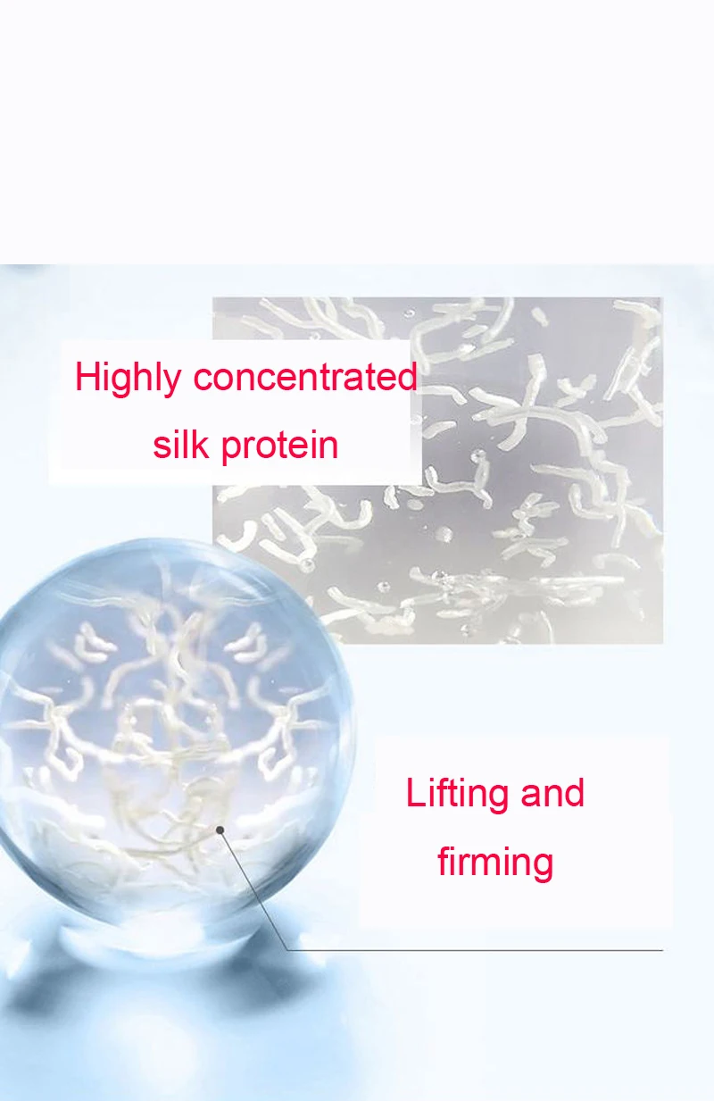 Особенности; Шелковая линия фиброина, добываемая из шелковой белковой линии с высокой чистотой. Этот Шелковый фиброин обладает сильной эластичностью, хорошей прочностью, нерастворим в воде и хорошо соответствует структуре волокон кожи. Это своего рода lytic фермент, извлекаемый из тела шелкопряда. Белковая линия полностью растворяется в жидком состоянии и вводится в слой дермы прибором. Под действием температуры кожи жидкий шелк фиброин превращается в твердый шелк фиброин, тем самым прочно вытягивая растягивающуюся сеть в коже, придавая коже мощную силу. Поддержка, стимулируя фиброз кожи, глубоко в дерме, стимулирует регенерацию коллагена и реформу эластичных волокон, регенерирует леса соединительной ткани для устойчивой поддержки, в то время как кожа восстанавливает эластичность и тонкие линии исчезают