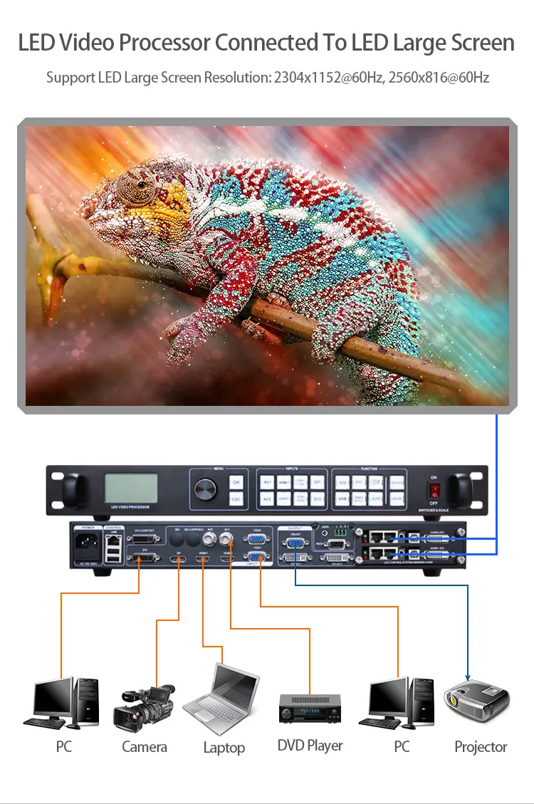 Плавно Переключайте любой канал 1 DP, 1 DVI, 2HDMI, 2 VGA, 2 AV Функция обнаружения сигнала ● Поддержка аудиовыхода > Поддержка большого соединения 10x10 ● Поддержка пользовательского разрешения на выходе 2304x1152 @ 60 Гц, 2560x816 @ 60 Гц, 3840x640 @ 60 Гц Технология предварительного переключения ⑤ 34 показывает эффект произвольного переключения → Режим сохранения и отзыва Черный экран и замораживание с одной клавишей ⑤ Настройки регулировки ручки ►Поддержка управления интерфейсом RS232 > DVI-Loop Out удобный для многосплайсинга ① Аналогичный видеопроцессор nova vx4s vdwall lvp605 lvp615s и т. Д. • Поддержка 2 карт отправки, таких как nova msd300 linsn ts802d colorlight s2 dbstar hvt11in и т. д.