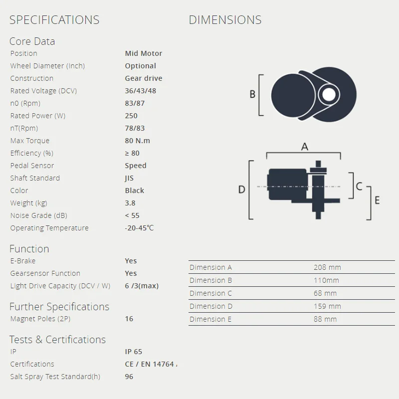 Положение: Средний двигатель Конструкция: привод передач Мощность: 250 Вт Номинальное напряжение (DCV): 36/43/48 Ток контроллера: 15а Размер нижнего кронштейна: 68 мм Рабочая температура:-20-45 ℃ N0 (об/мин): 83/87 NT (об/мин): 78/83 Максимальный крутящий момент: 80 Н. М Эффективность (%): ≥ 80 Датчик педали: Датчик скорости Стандарт вала: JIS Вес нетто (кг): 3,8 Уровень шума (дБ): <55 Е-тормоз: да Функция датчика: Да Емкость привода (DCV/W) светильник: 6/3 (макс.) Магнитные полюсы (2P): 16 Сертификация: CE/EN14764/ROHS Стандарт теста на солевое содержание (h): 96
