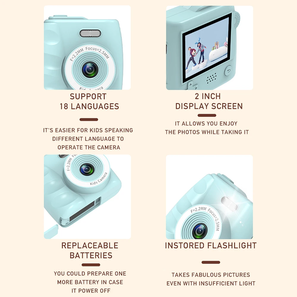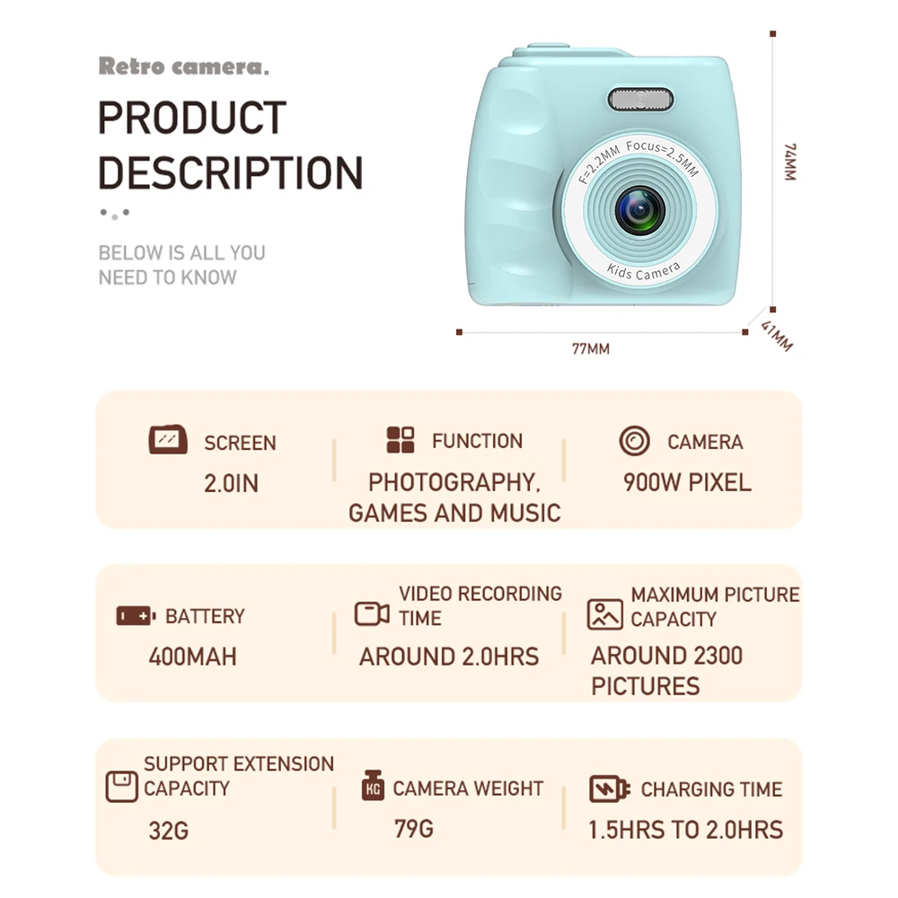 Детская камера с ретро-дизайном и мягким цветом, цените самый момент в одном нажатии. Испытайте удовольствие от мира и развивайте больше воображения благодаря этому маленькому хорошему партнеру.