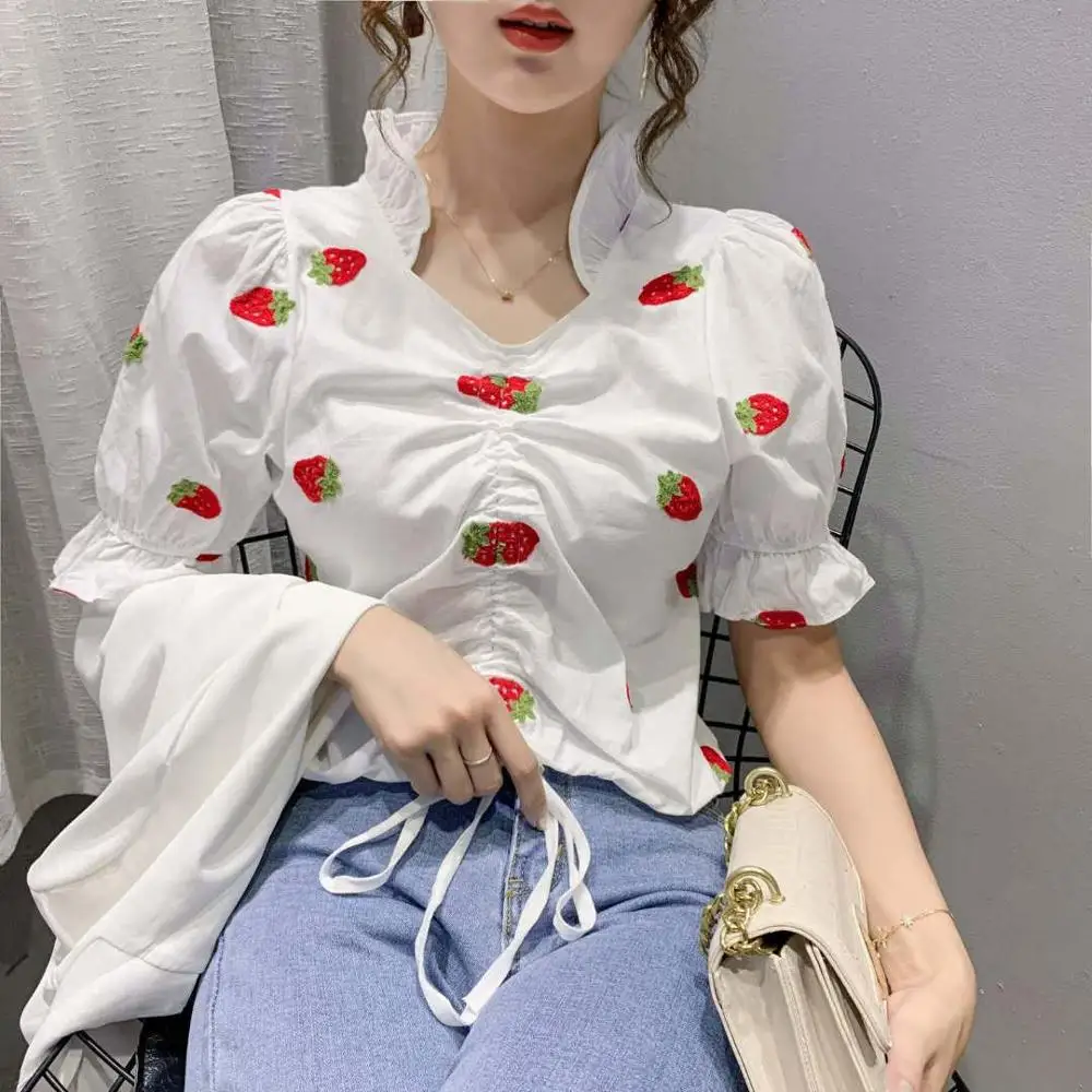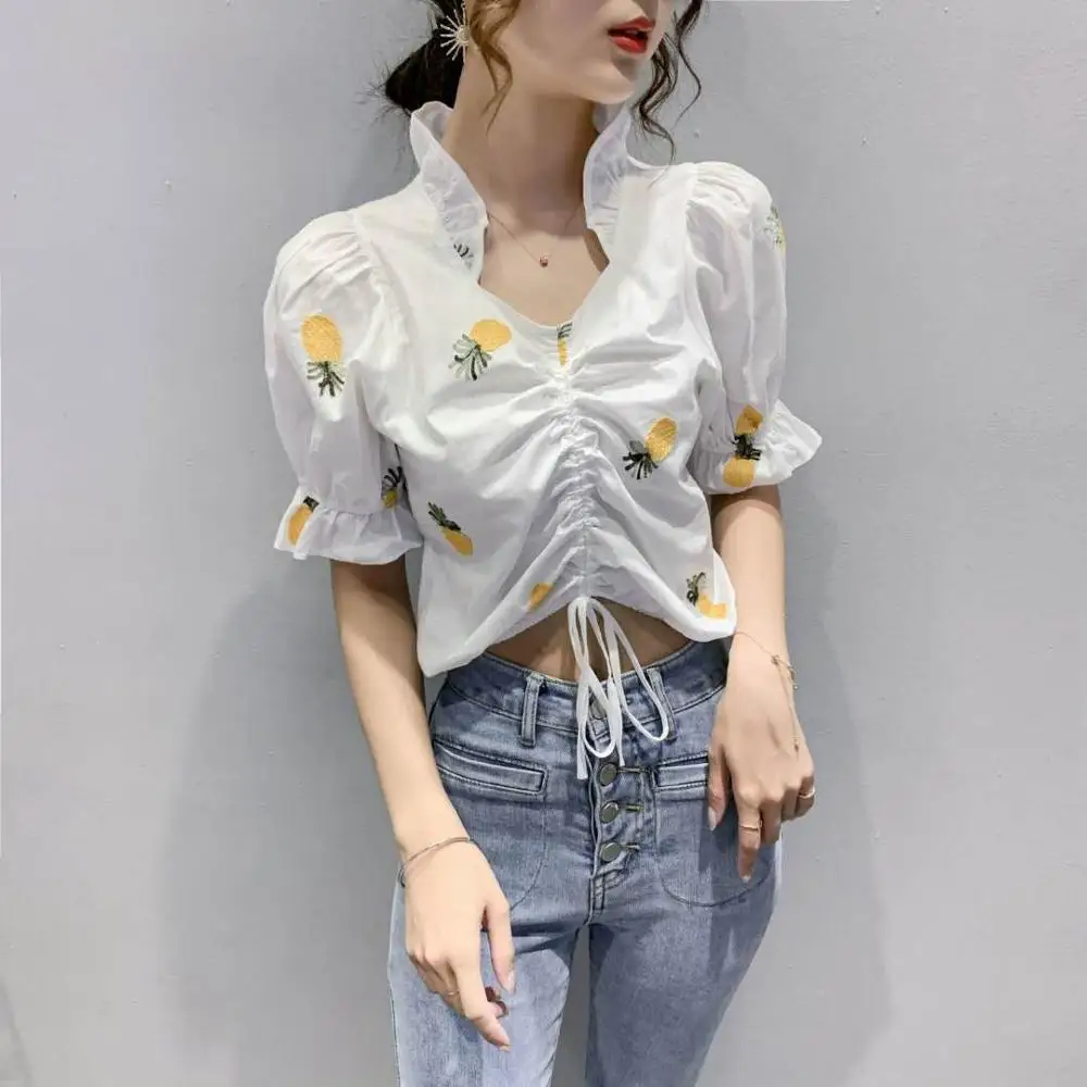 Хлопковые футболки с вышивкой и коротким рукавом, женские футболки с воротником-стойкой и рукавами-фонариками, модные женские топы с завязками, бесплатная доставка