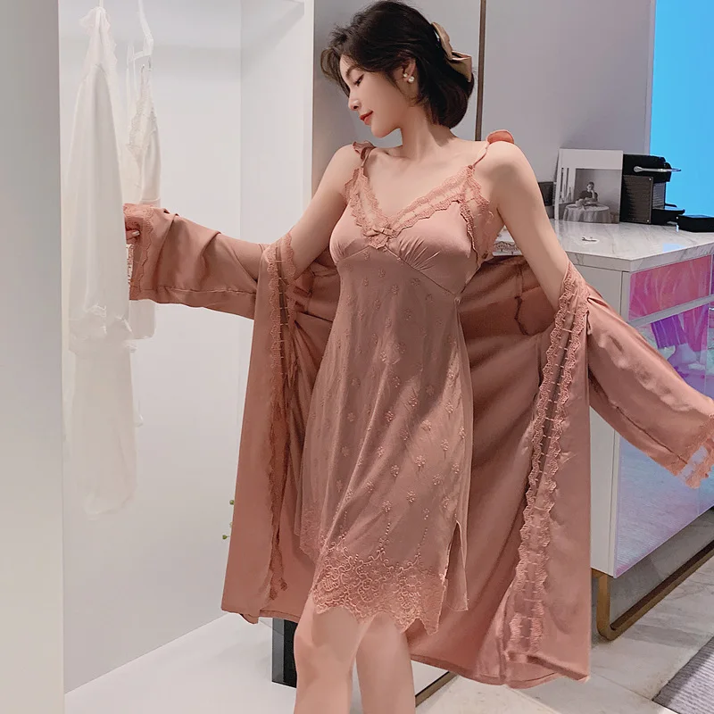 Отзывы о Шелковая ночная рубашка комплект из 2 предметов халат Весенняя Пижама