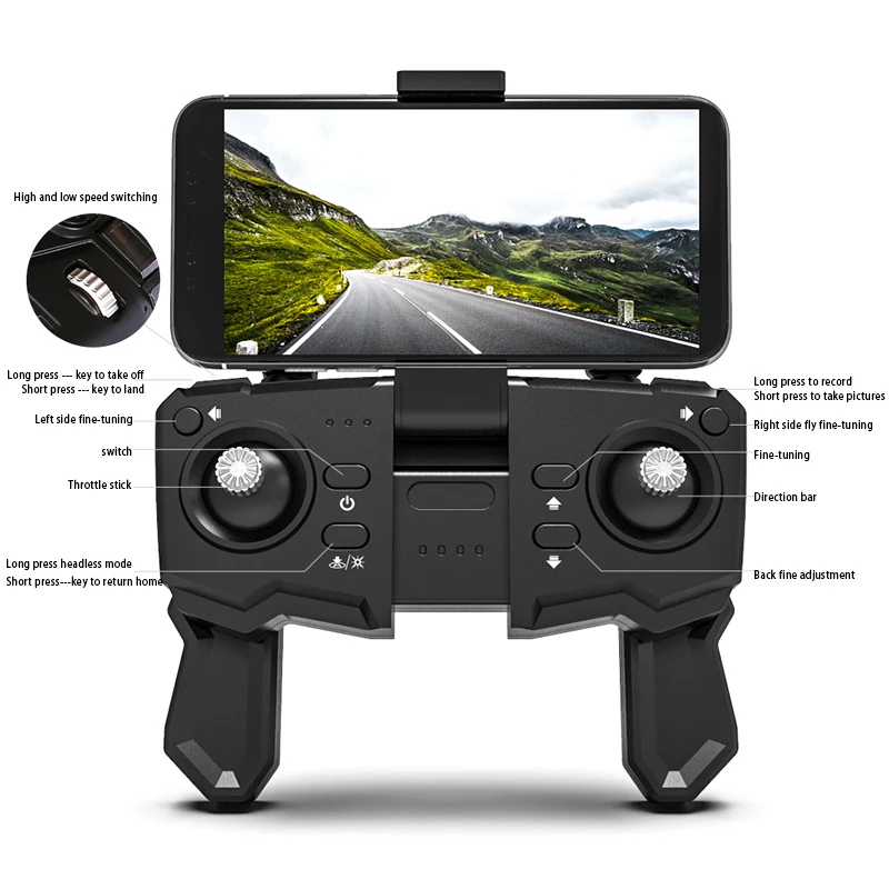 1.Функции-Вверх/вниз, влево/вправо, вперед/назад, влево/вправо, быстрый/медленный контроль скорости, возврат одной кнопки, Безголовый режим, оптическое позиционирование потока, фото/видео с жестами, функция отслеживания. Двойной переключатель камеры, светодиодный свет.