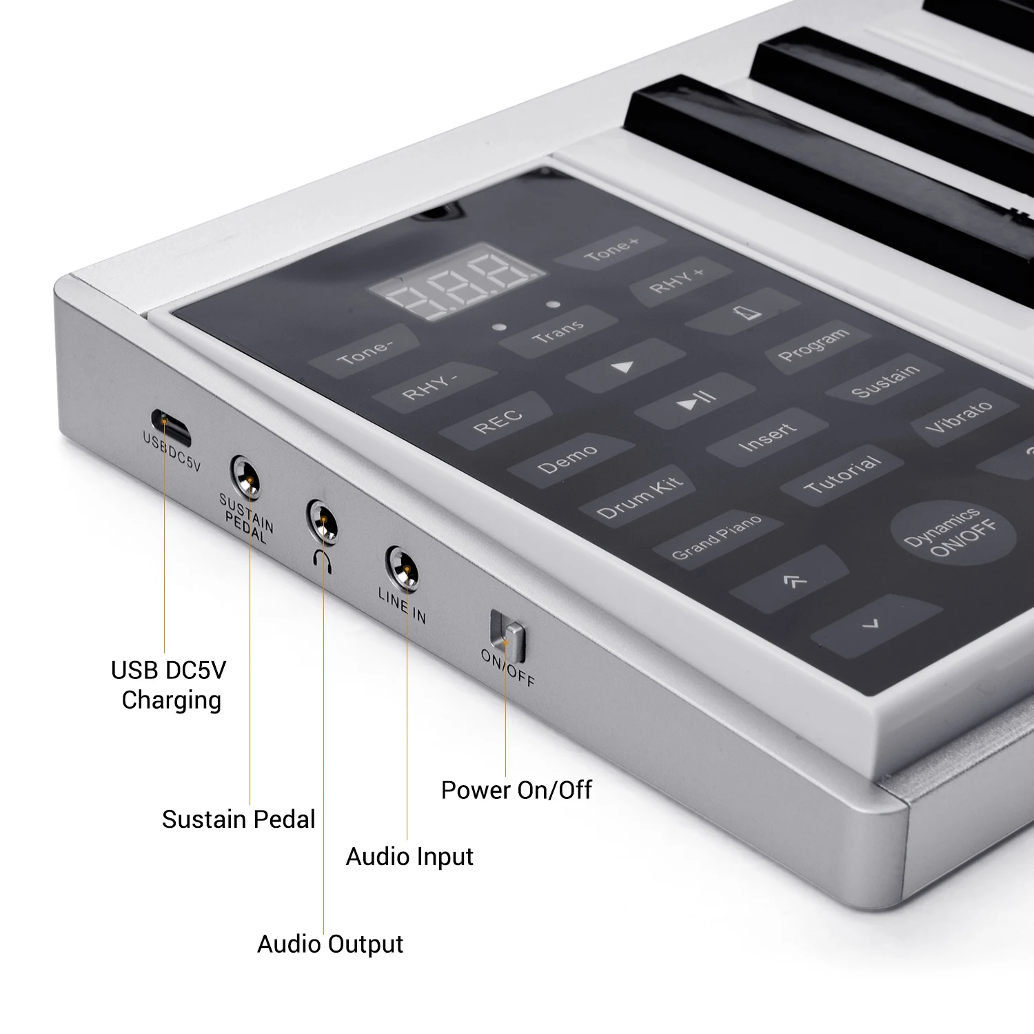 Портативная электронная фортепианная клавиатура: портативная фортепианная клавиатура имеет 128 тонов, 128 ритмов, 14 демонстрационных песен, с аккордом, поддержка (с педалью поддержки), метроном, записью, воспроизведением, учебником, барабанный набор и фортепианные игры функции.