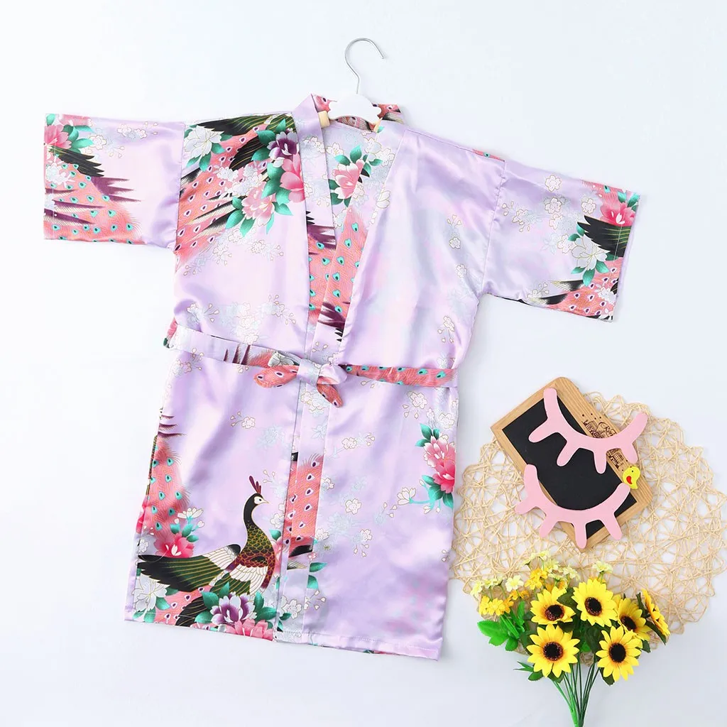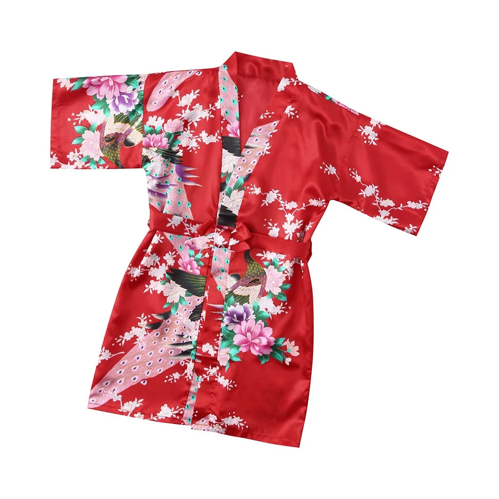 Пижамы летняя детская Ночная одежда для малышей Детская одежда для девочек с цветочным рисунком Шелковый атласное кимоно; Наряд, одежда для сна, одежда халат